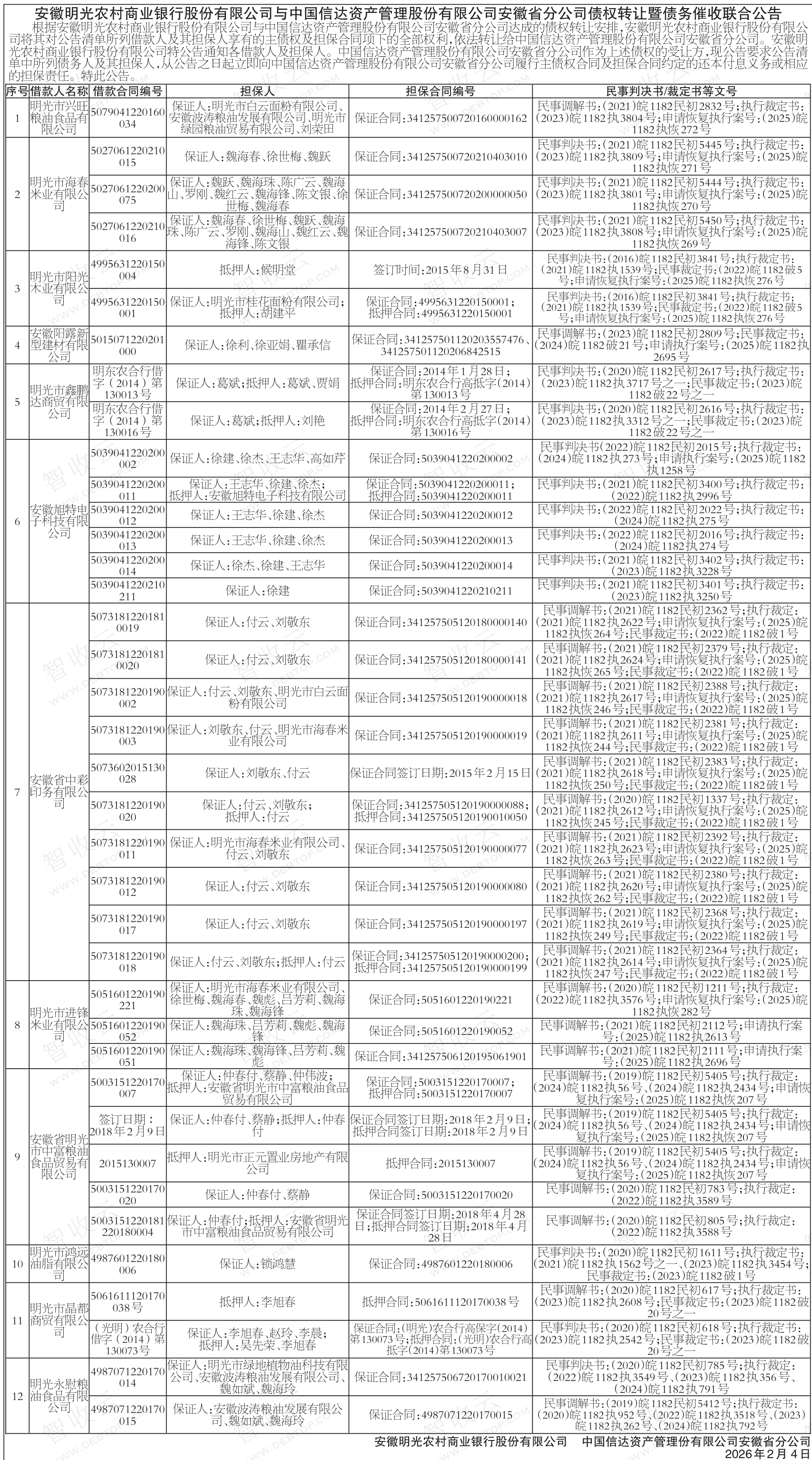 明光市进锋米业有限公司,明光市海春米业有限公司,安徽明光农村商业银行股份有限公司与中国信达资产管理股份有限公司安徽省分公司债权转让暨债务催收联合公告,公告日期:2026-02-04,转让方:安徽明光农村商业银行股份有限公司,受让方:中国信达资产管理股份有限公司安徽省分公司,资产总额:0.0万元。