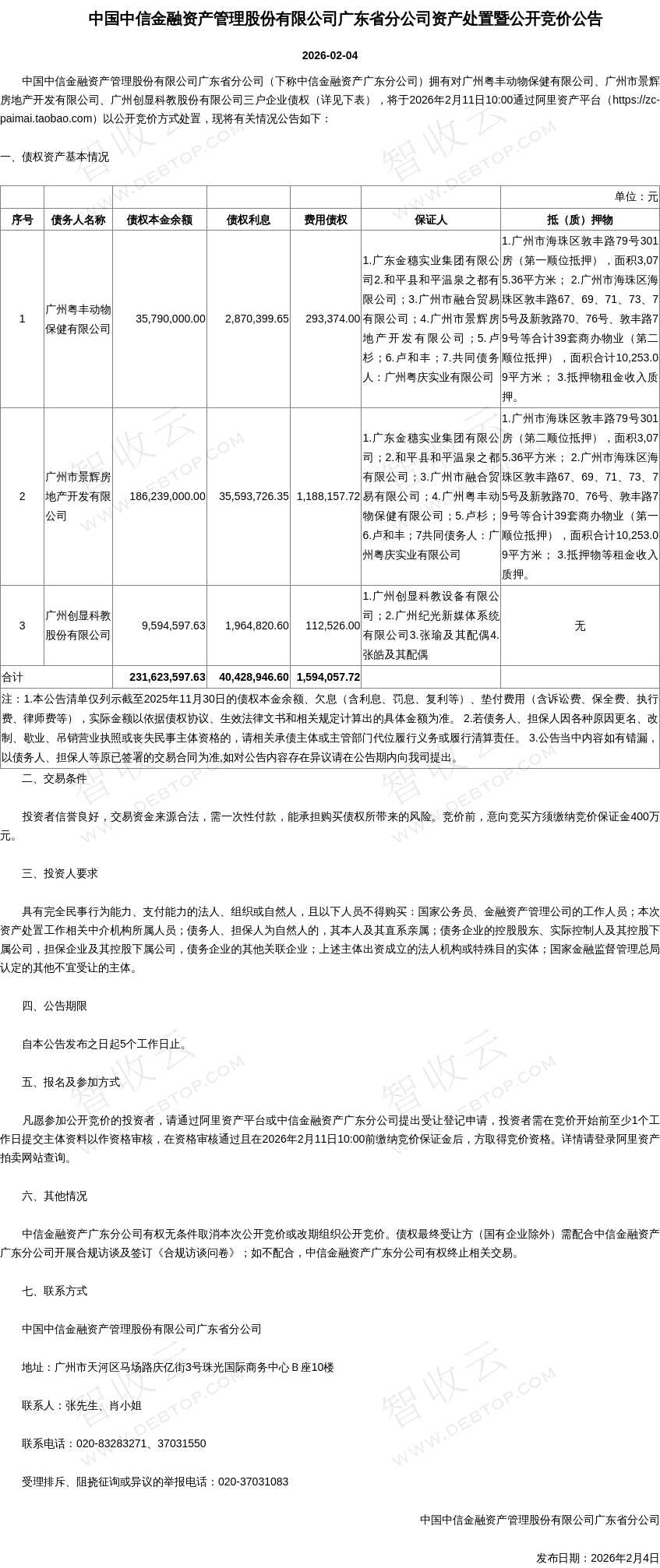 广州市景辉房地产开发有限公司,广州创显科教股份有限公司,中国中信金融资产管理股份有限公司广东省分公司资产处置暨公开竞价公告,公告日期:2026-02-04,债权方:中国中信金融资产管理股份有限公司广东省分公司,资产总额:27364.7万元。