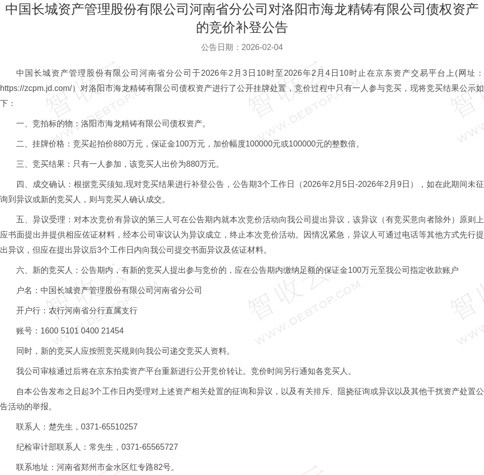 洛阳市海龙精铸有限公司,中国长城资产管理股份有限公司河南省分公司对洛阳市海龙精铸有限公司债权资产的竞价补登公告,公告日期:2026-02-04,债权方:中国长城资产管理股份有限公司河南省分公司,资产总额:880.0万元。