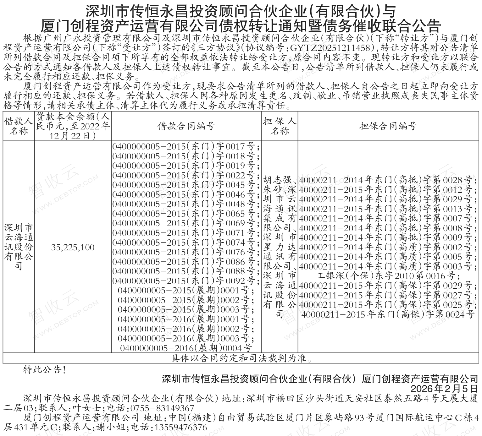 深圳市云海通讯股份有限公司,深圳市云海通讯集成有限公司,深圳市传恒永昌投资顾问合伙企业(有限合伙)与厦门创程资产运营有限公司债权转让通知暨债务催收联合公告,公告日期:2026-02-05,转让方:广州广永投资管理有限公司,深圳市传恒永昌投资顾问合伙企业(有限合伙),受让方:厦门创程资产运营有限公司,资产总额:3522.5万元。