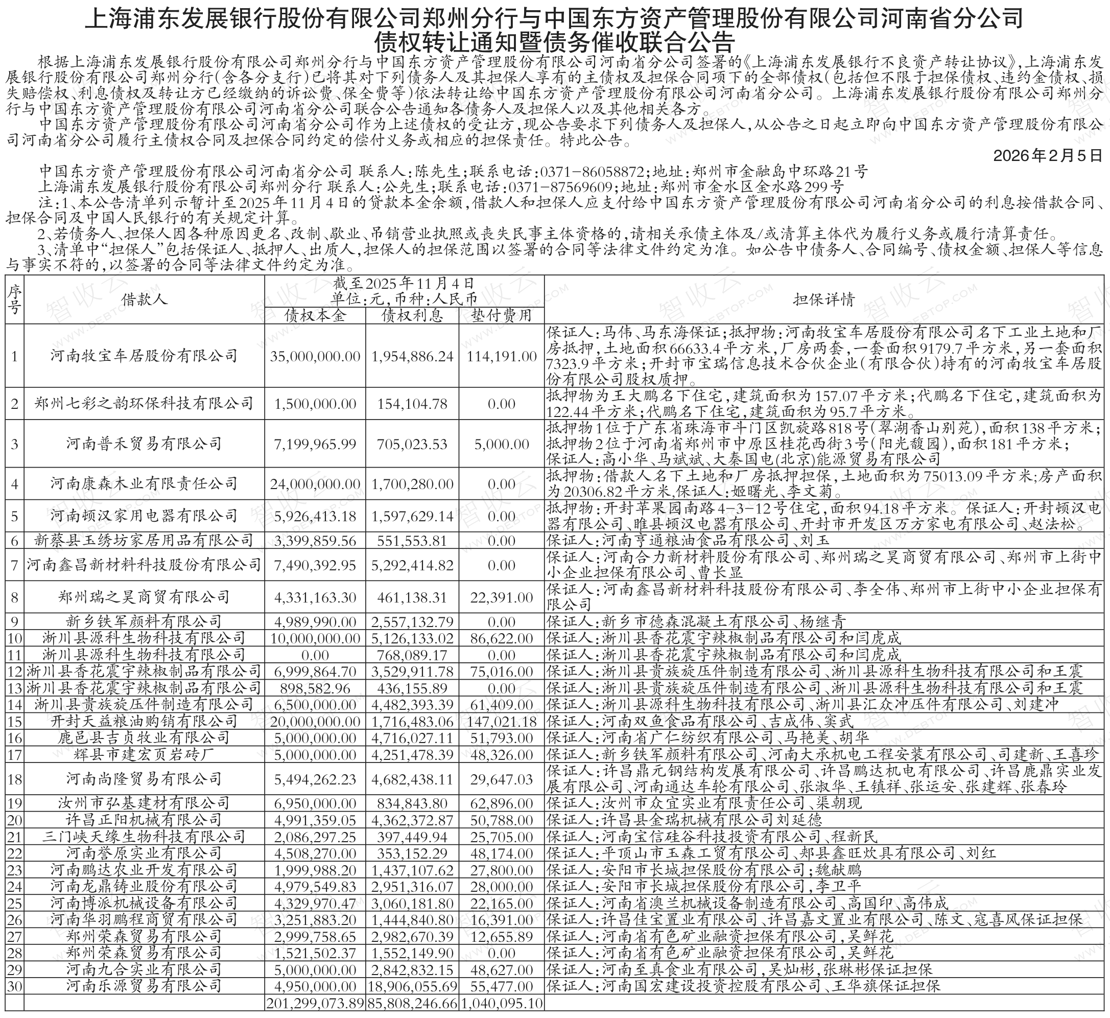 河南华羽鹏程商贸有限公司,新乡铁军颜料有限公司,上海浦东发展银行股份有限公司郑州分行与中国东方资产管理股份有限公司河南省分公司债权转让通知暨债务催收联合公告,公告日期:2026-02-05,转让方:上海浦东发展银行股份有限公司郑州分行,受让方:中国东方资产管理股份有限公司河南省分公司,资产总额:28814.7万元。