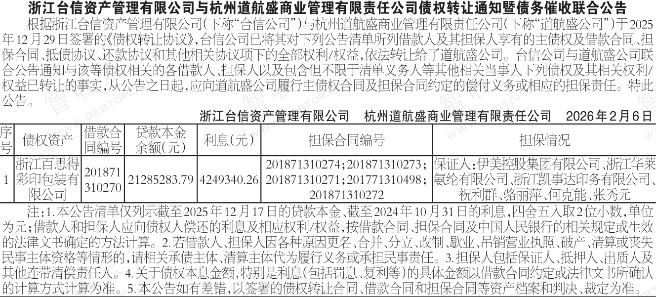 浙江凯事达印务有限公司,伊美控股集团有限公司,浙江台信资产管理有限公司与杭州道航盛商业管理有限责任公司债权转让通知暨债务催收联合公告,公告日期:2026-02-06,转让方:浙江台信资产管理有限公司,受让方:杭州道航盛商业管理有限责任公司,资产总额:102553.5万元。