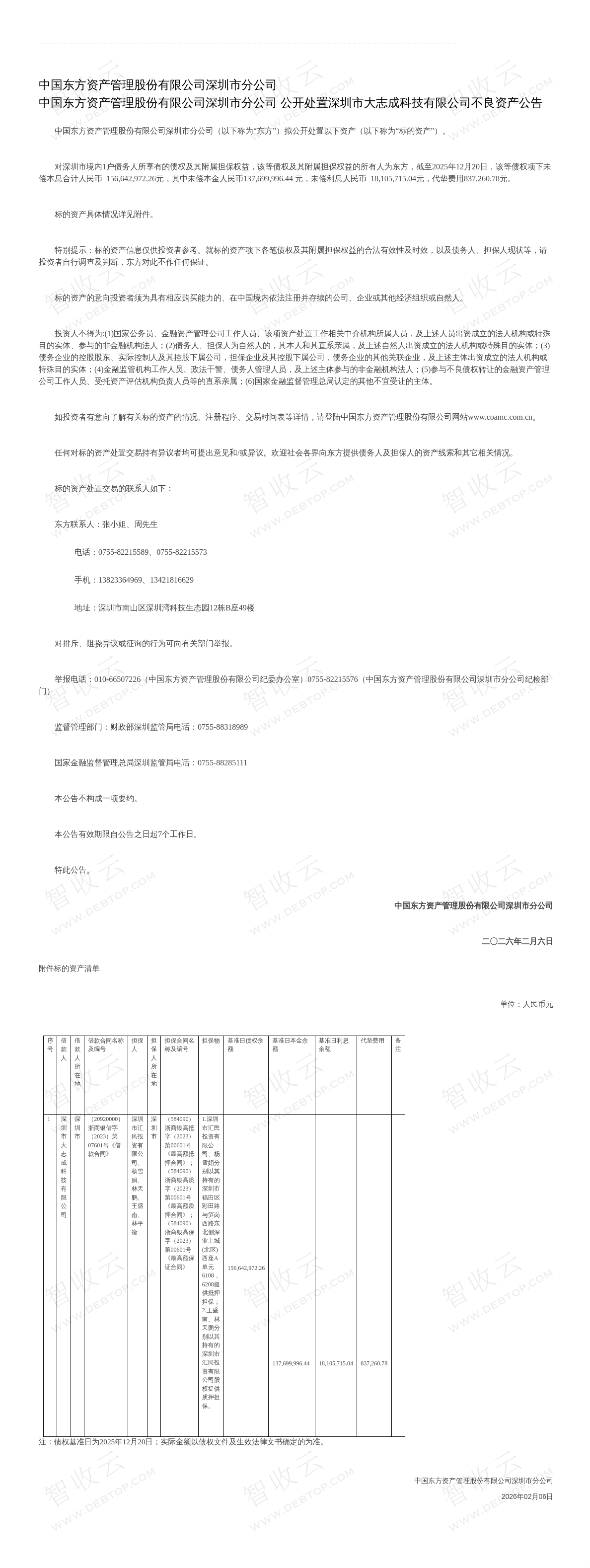 深圳市大志成科技有限公司,深圳市汇民投资有限公司,中国东方资产管理股份有限公司深圳市分公司公开处置深圳市大志成科技有限公司不良资产公告,公告日期:2026-02-06,债权方:中国东方资产管理股份有限公司深圳市分公司,资产总额:15664.3万元。