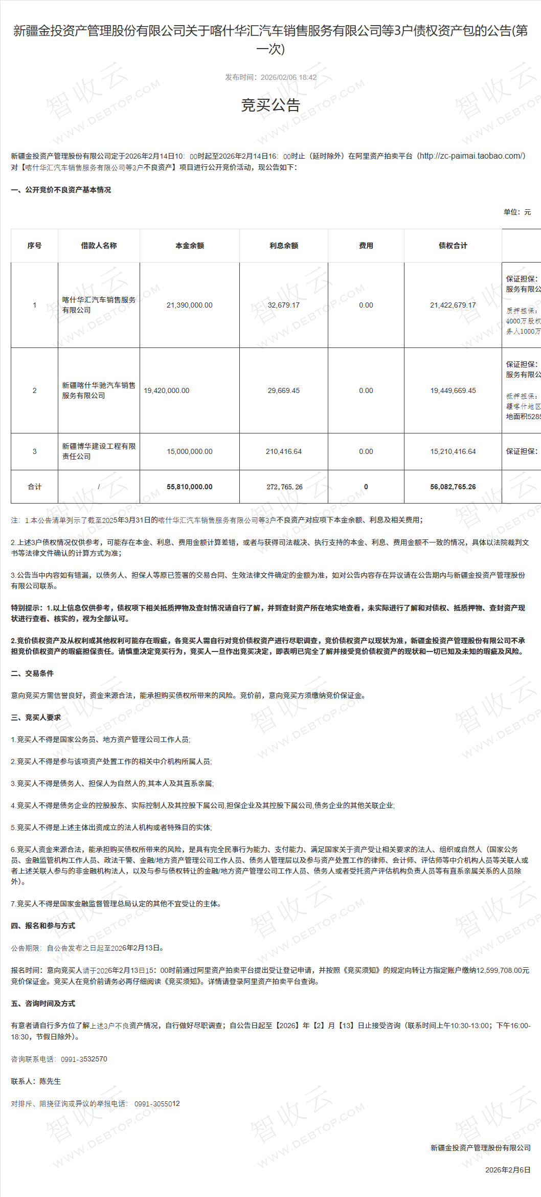 新疆喀什华驰汽车销售服务有限公司,喀什华汇汽车销售服务有限公司,新疆金投资产管理股份有限公司关于喀什华汇汽车销售服务有限公司等3户债权资产包的公告(第一次),公告日期:2026-02-06,债权方:新疆金投资产管理股份有限公司,资产总额:5608.3万元。