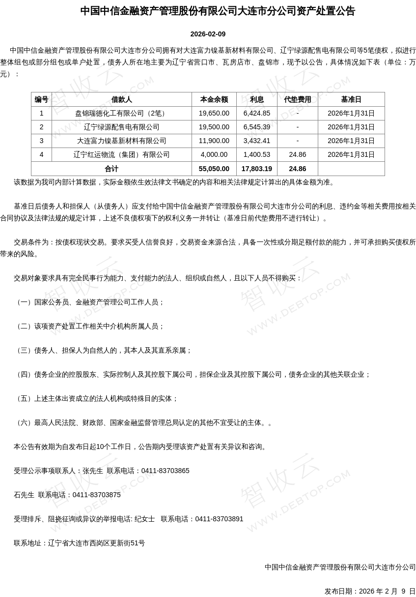 辽宁红运物流(集团)有限公司,盘锦瑞德化工有限公司,中国中信金融资产管理股份有限公司大连市分公司资产处置公告,公告日期:2026-02-09,债权方:中国中信金融资产管理股份有限公司大连市分公司,资产总额:72878.0万元。