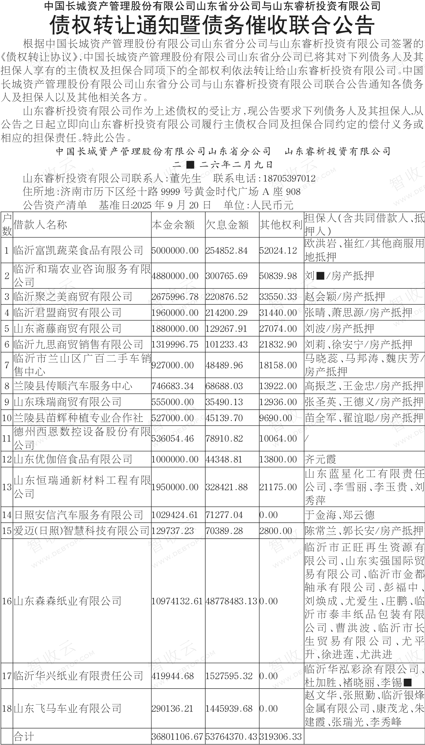 临沂华兴纸业有限责任公司,山东飞马车业有限公司,中国长城资产管理股份有限公司山东省分公司与山东睿析投资有限公司债权转让通知暨债务催收联合公告,公告日期:2026-02-09,转让方:中国长城资产管理股份有限公司山东省分公司,受让方:山东睿析投资有限公司,资产总额:9088.5万元。