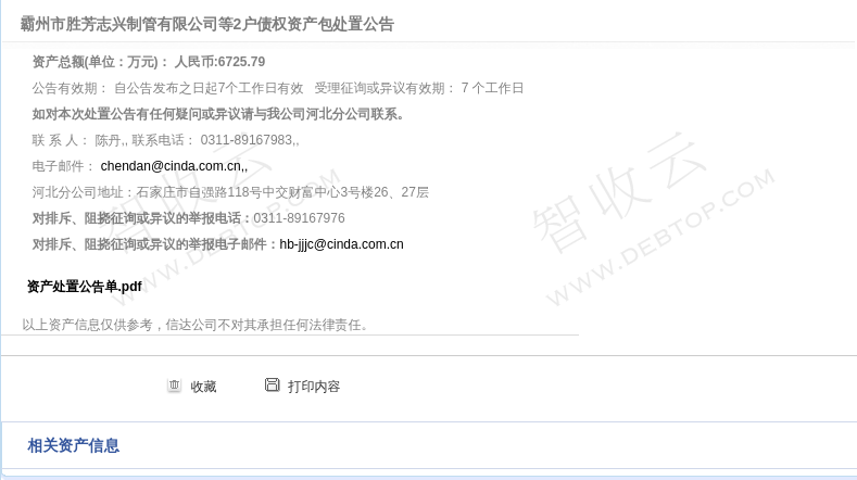 霸州市宏升实业有限公司,霸州市胜芳志兴制管有限公司,霸州市胜芳志兴制管有限公司等2户债权资产包处置公告,公告日期:2026-02-09,债权方:中国信达资产管理股份有限公司河北分公司,资产总额:6725.8万元。