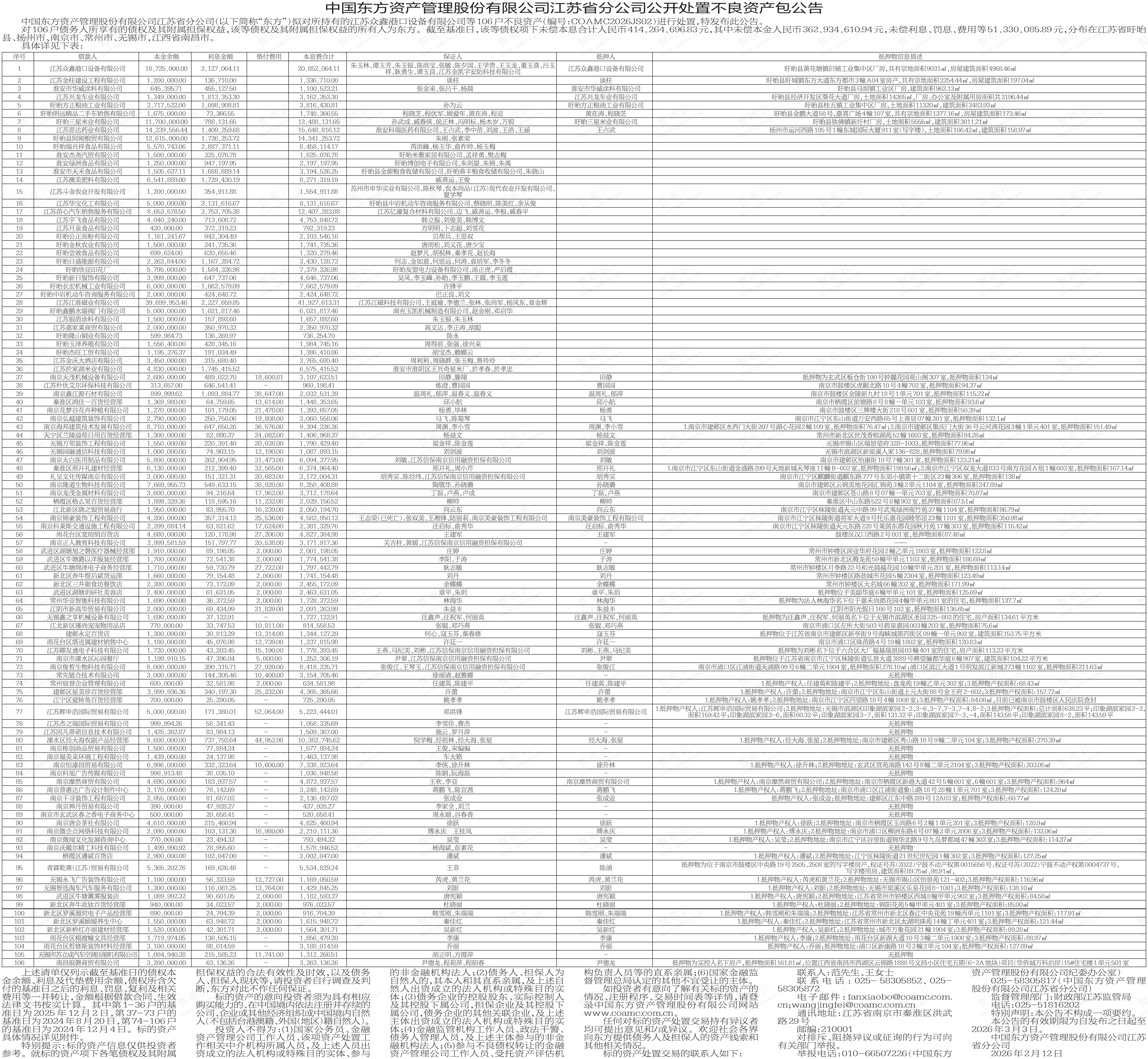 淮安绿洲食品有限公司,盱眙尝效食品有限公司,中国东方资产管理股份有限公司江苏省分公司公开处置不良资产包公告,公告日期:2026-02-12,债权方:中国东方资产管理股份有限公司江苏省分公司,资产总额:41508.7万元。