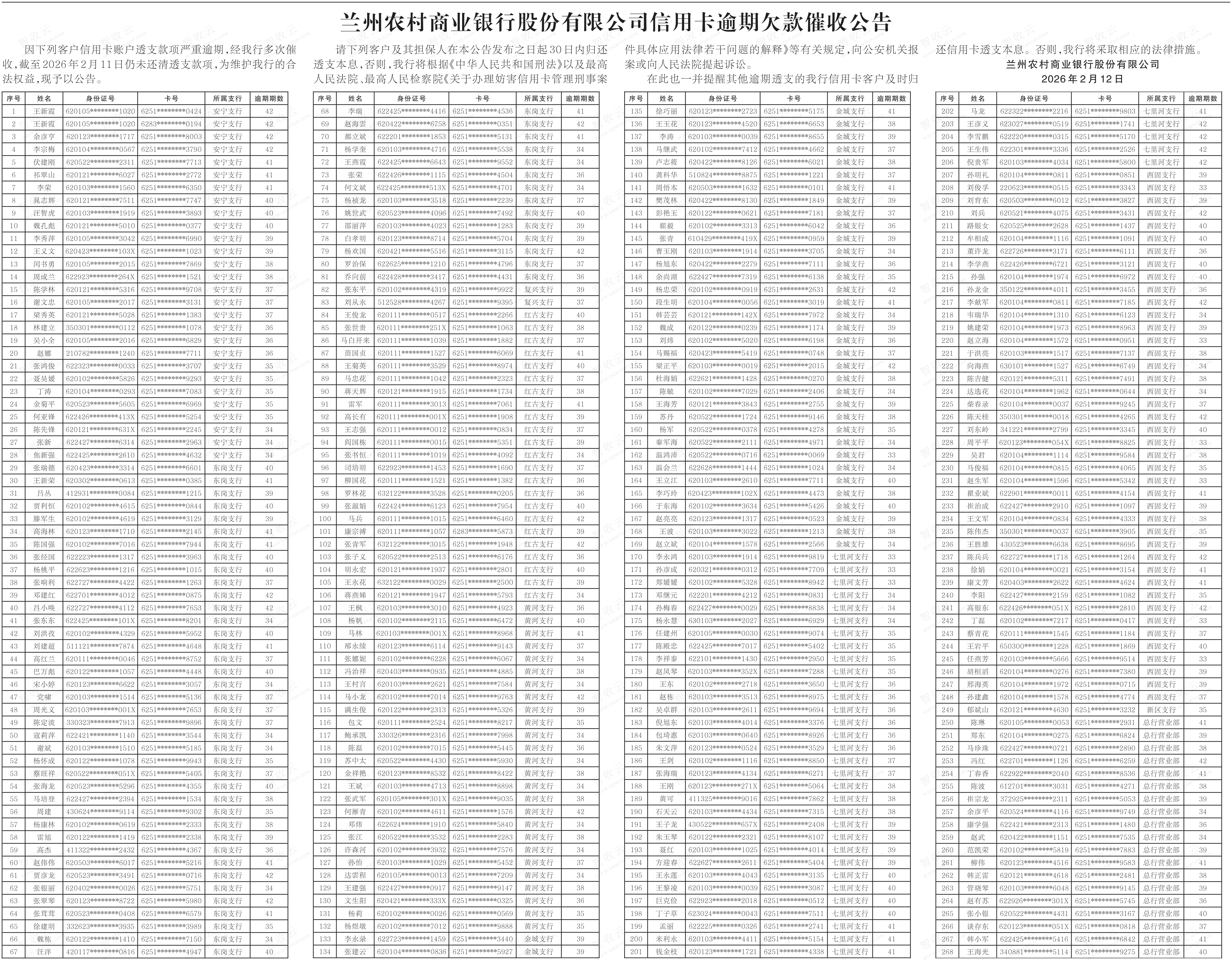 催收公告兰州农村商业银行股份有限公司信用卡逾期欠款催收公告 ,兰州农村商业银行股份有限公司信用卡逾期欠款催收公告,公告日期:2026-02-12,债权方:兰州农村商业银行股份有限公司,资产总额:0.0万元。张翠琴,李涛,王文军等268户。来源:甘肃经济日报 公告日期:2026-02-12债权金额债权本金户数268户