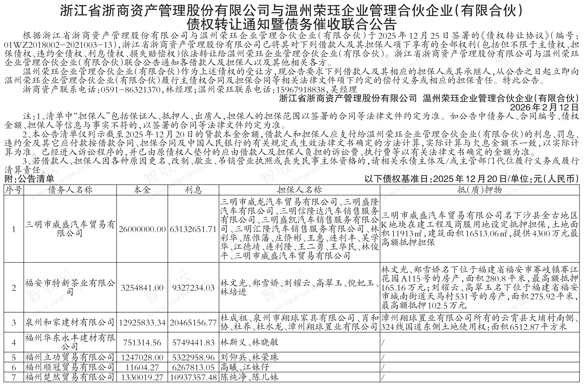 泉州和家建材有限公司,福州华东永丰建材有限公司,浙江省浙商资产管理股份有限公司与温州荣珏企业管理合伙企业(有限合伙)债权转让通知暨债务催收联合公告,公告日期:2026-02-12,转让方:浙江省浙商资产管理股份有限公司,受让方:温州荣珏企业管理合伙企业(有限合伙),资产总额:16672.3万元。