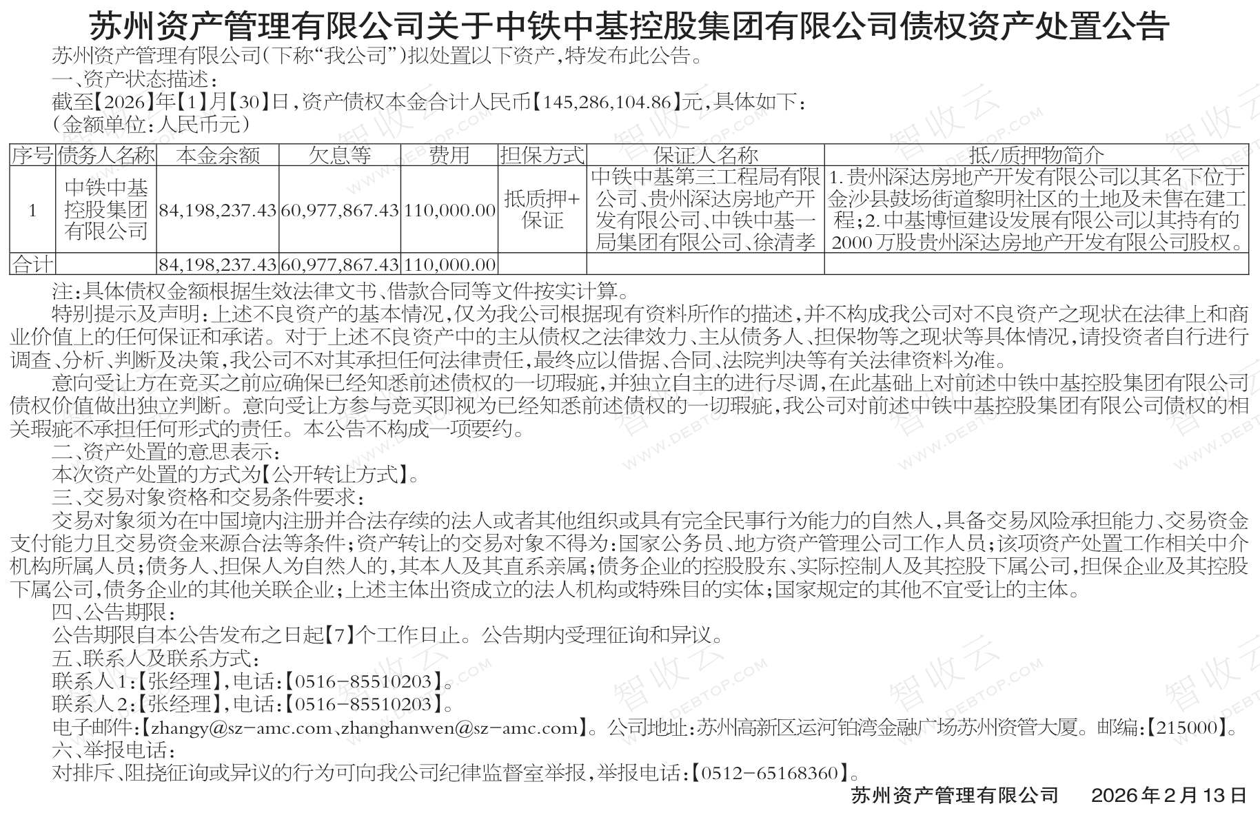 中铁中基控股集团有限公司,中铁中基第三工程局有限公司,苏州资产管理有限公司关于中铁中基控股集团有限公司债权资产处置公告,公告日期:2026-02-13,债权方:苏州资产管理有限公司,资产总额:14528.6万元。