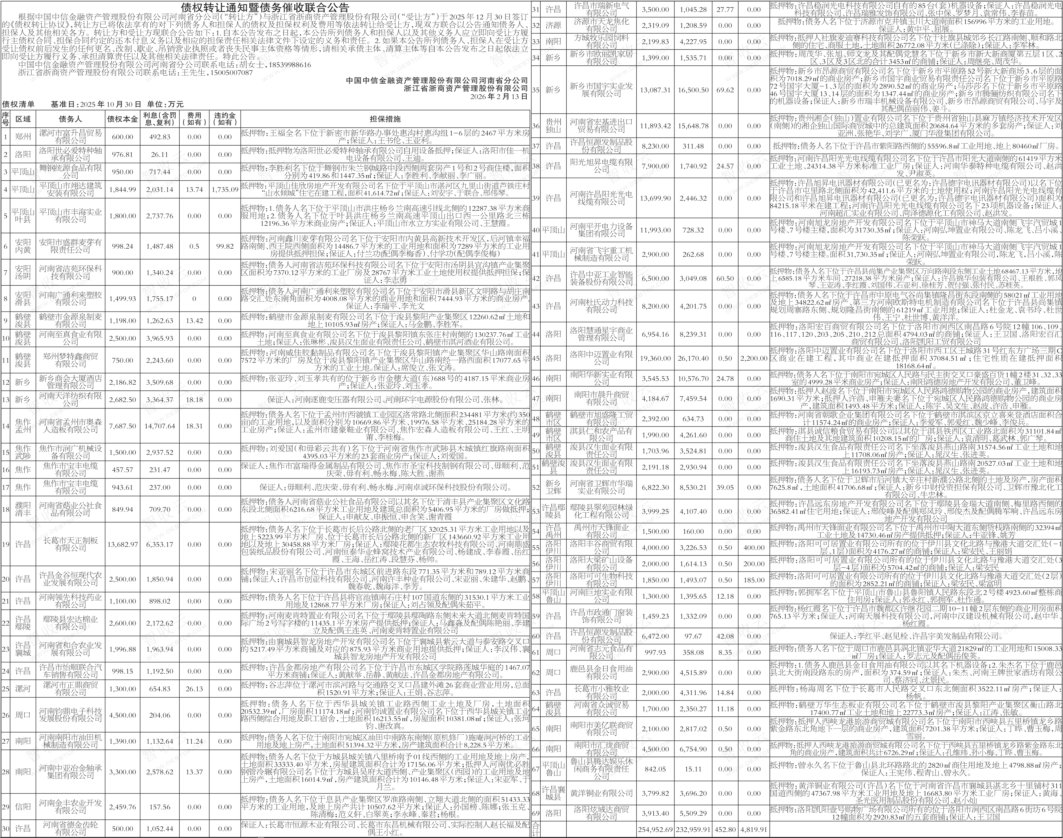 焦作市润广机械设备有限公司,济源市天龙焦化有限公司,债权转让通知暨债务催收联合公告,公告日期:2026-02-13,转让方:中国中信金融资产管理股份有限公司河南省分公司,受让方:浙江省浙商资产管理股份有限公司,资产总额:493185.3万元。