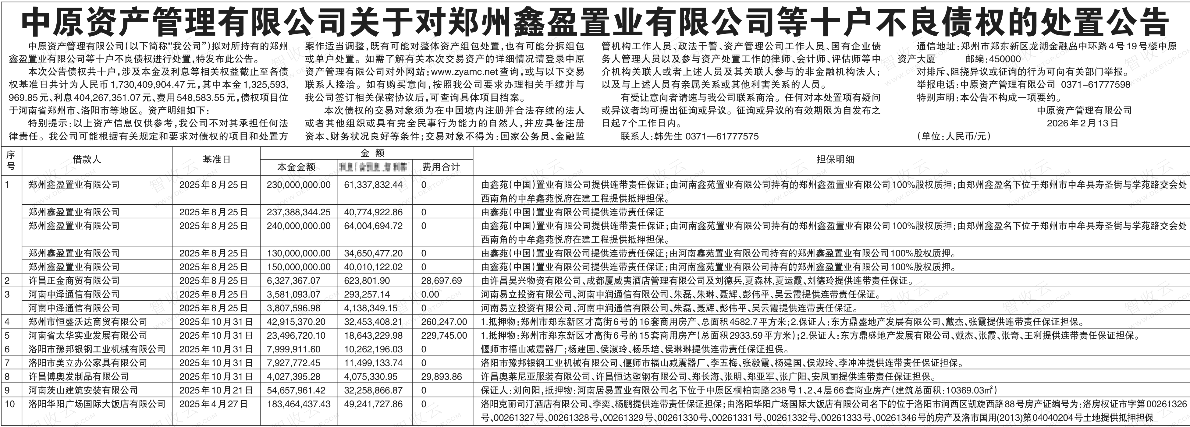 郑州市恒盛沃达商贸有限公司,河南省太华实业发展有限公司,中原资产管理有限公司关于对郑州鑫盈置业有限公司等十户不良债权的处置公告,公告日期:2026-02-13,债权方:中原资产管理有限公司,资产总额:173041.0万元。