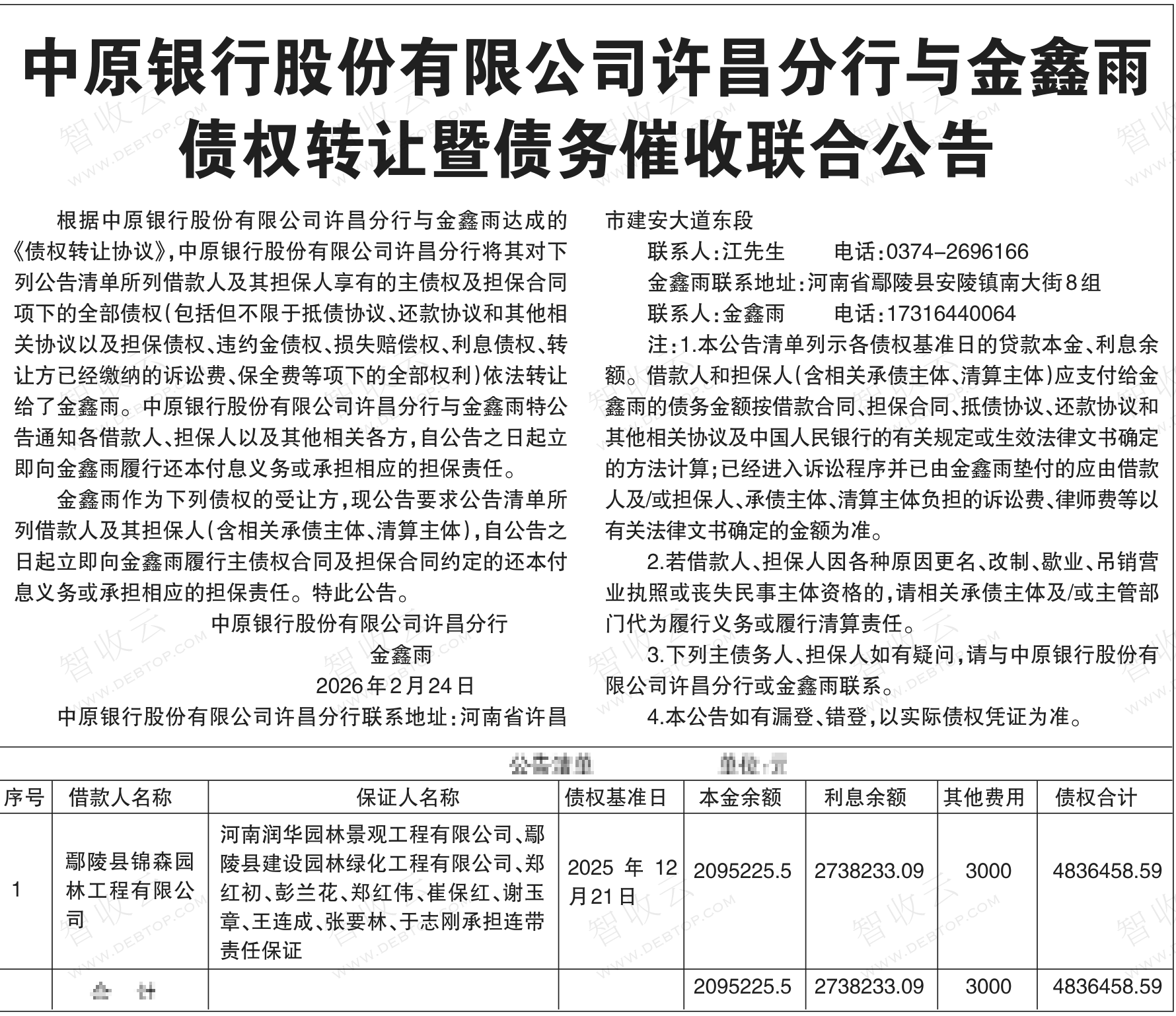鄢陵县锦森园林工程有限公司,河南润华园林景观工程有限公司,中原银行股份有限公司许昌分行与金鑫雨债权转让暨债务催收联合公告,公告日期:2026-02-24,转让方:中原银行股份有限公司许昌分行,受让方:金鑫雨,资产总额:483.6万元。