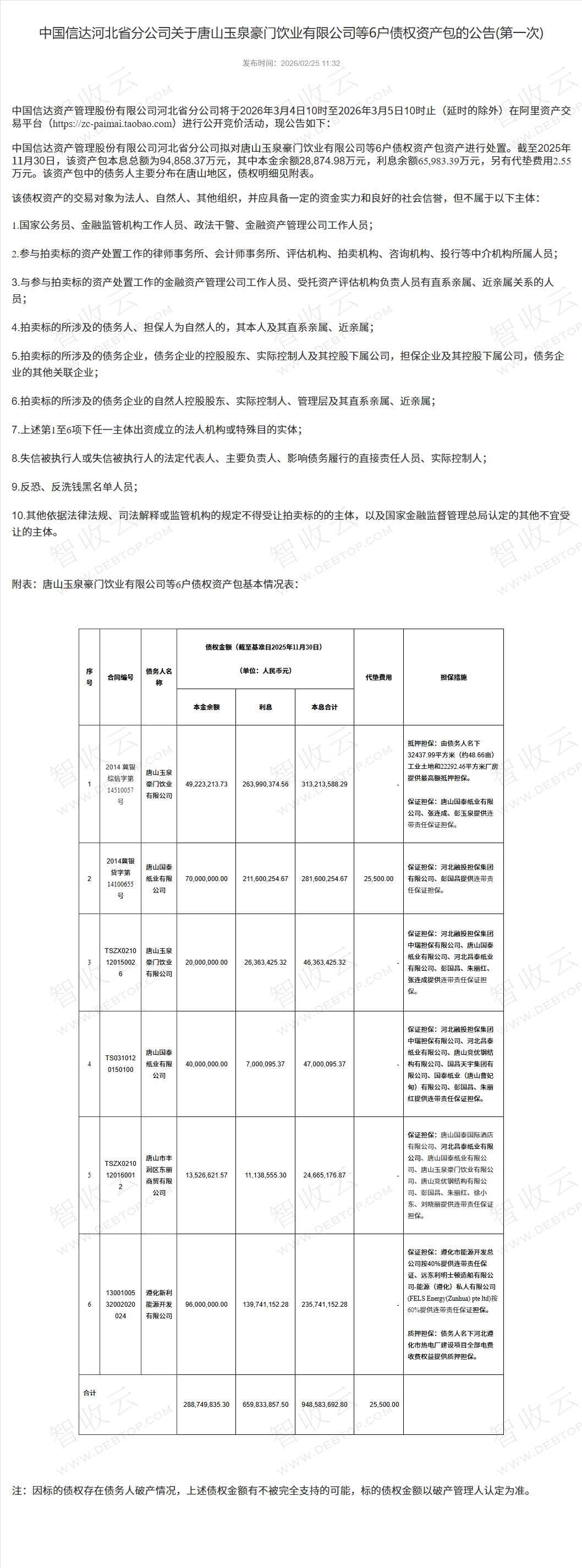 唐山国泰纸业有限公司,唐山玉泉豪门饮业有限公司,中国信达河北省分公司关于唐山玉泉豪门饮业有限公司等6户债权资产包的公告(第一次),公告日期:2026-02-25,债权方:中国信达资产管理股份有限公司河北省分公司,资产总额:94860.9万元。