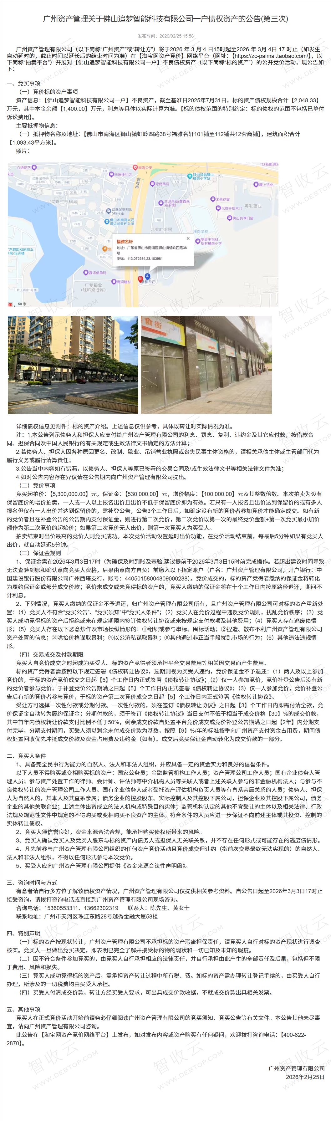 佛山追梦智能科技有限公司,广州资产管理关于佛山追梦智能科技有限公司一户债权资产的公告(第三次),公告日期:2026-02-25,债权方:广州资产管理有限公司,资产总额:2048.3万元。