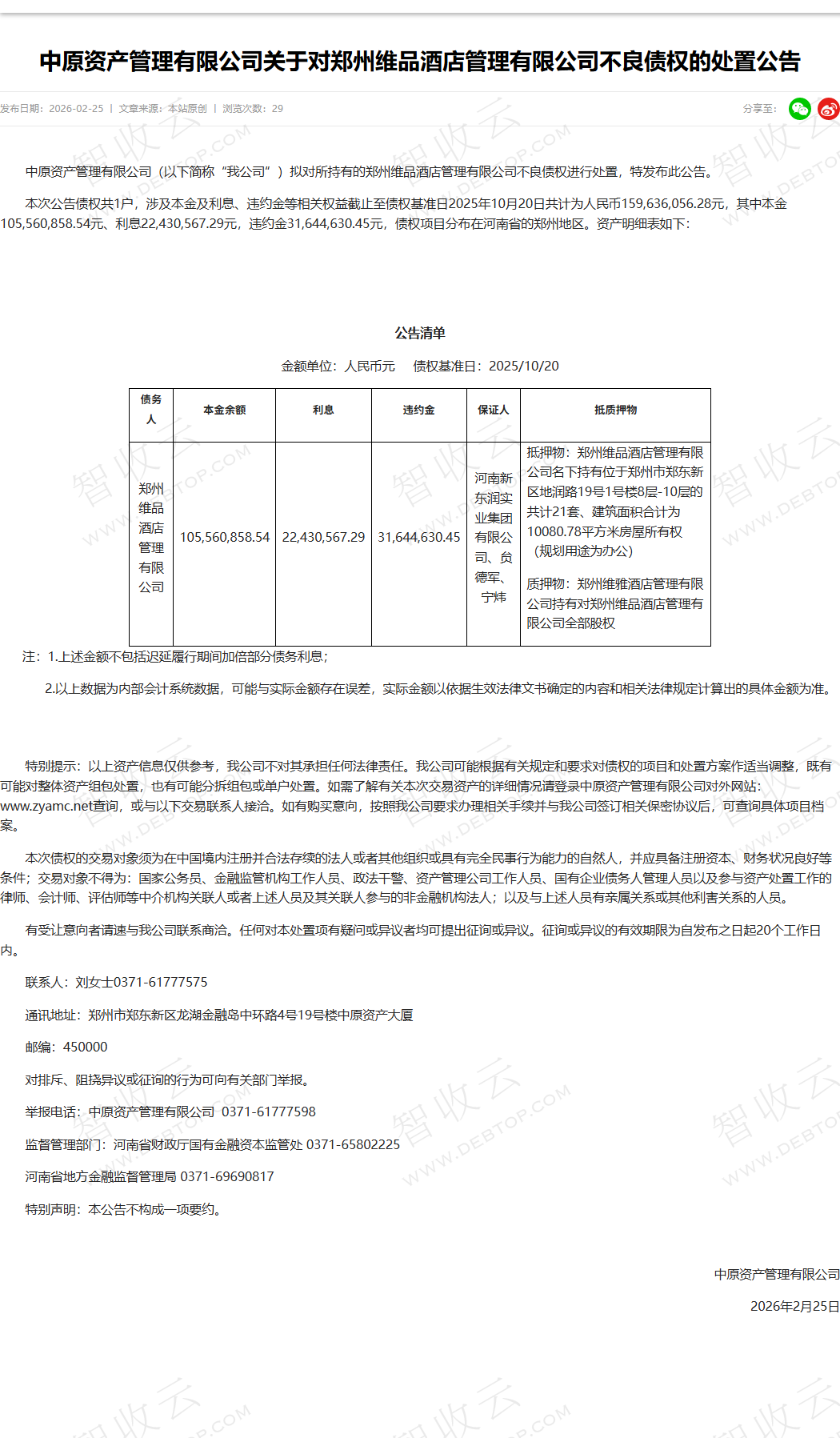 郑州维品酒店管理有限公司,河南新东润实业集团有限公司,中原资产管理有限公司关于对郑州维品酒店管理有限公司不良债权的处置公告,公告日期:2026-02-25,债权方:中原资产管理有限公司,资产总额:15963.6万元。