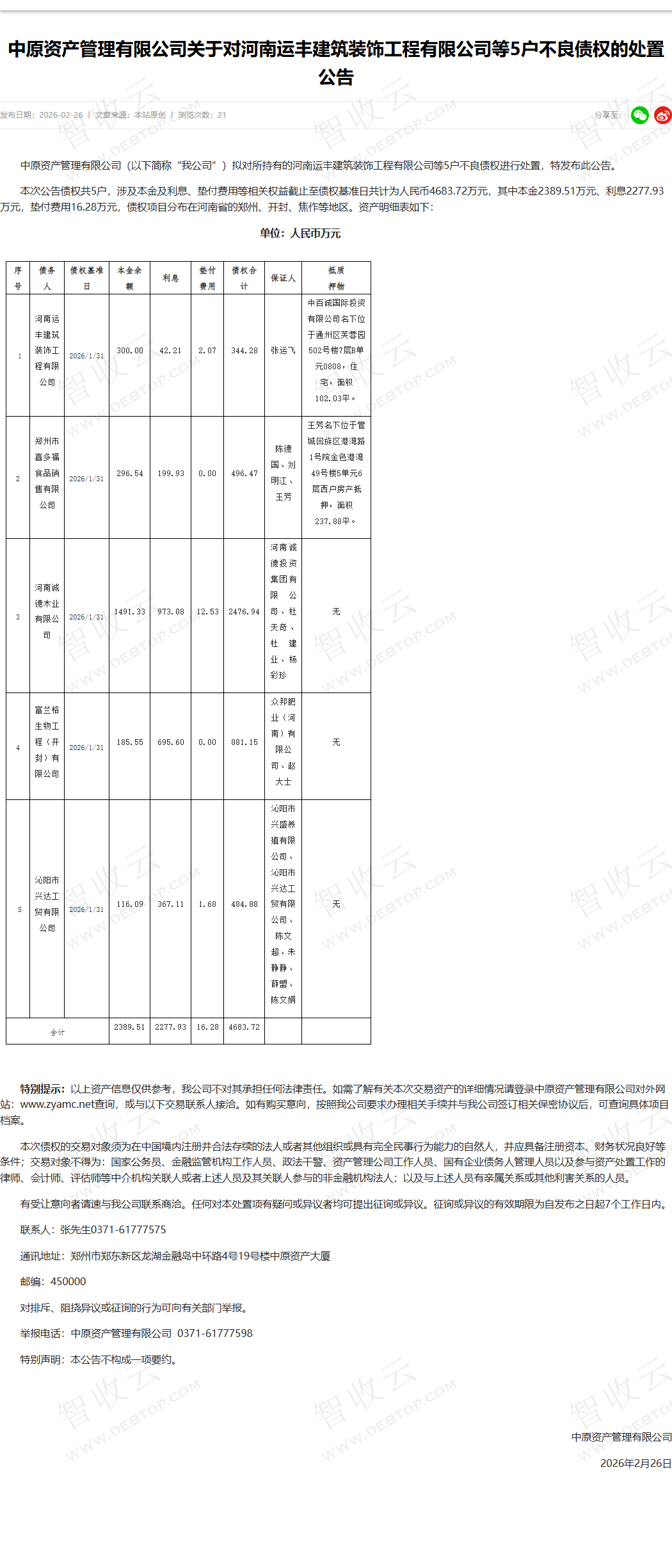 河南运丰建筑装饰工程有限公司,富兰格生物工程(开封)有限公司,中原资产管理有限公司关于对河南运丰建筑装饰工程有限公司等5户不良债权的处置公告,公告日期:2026-02-26,债权方:中原资产管理有限公司,资产总额:4683.7万元。