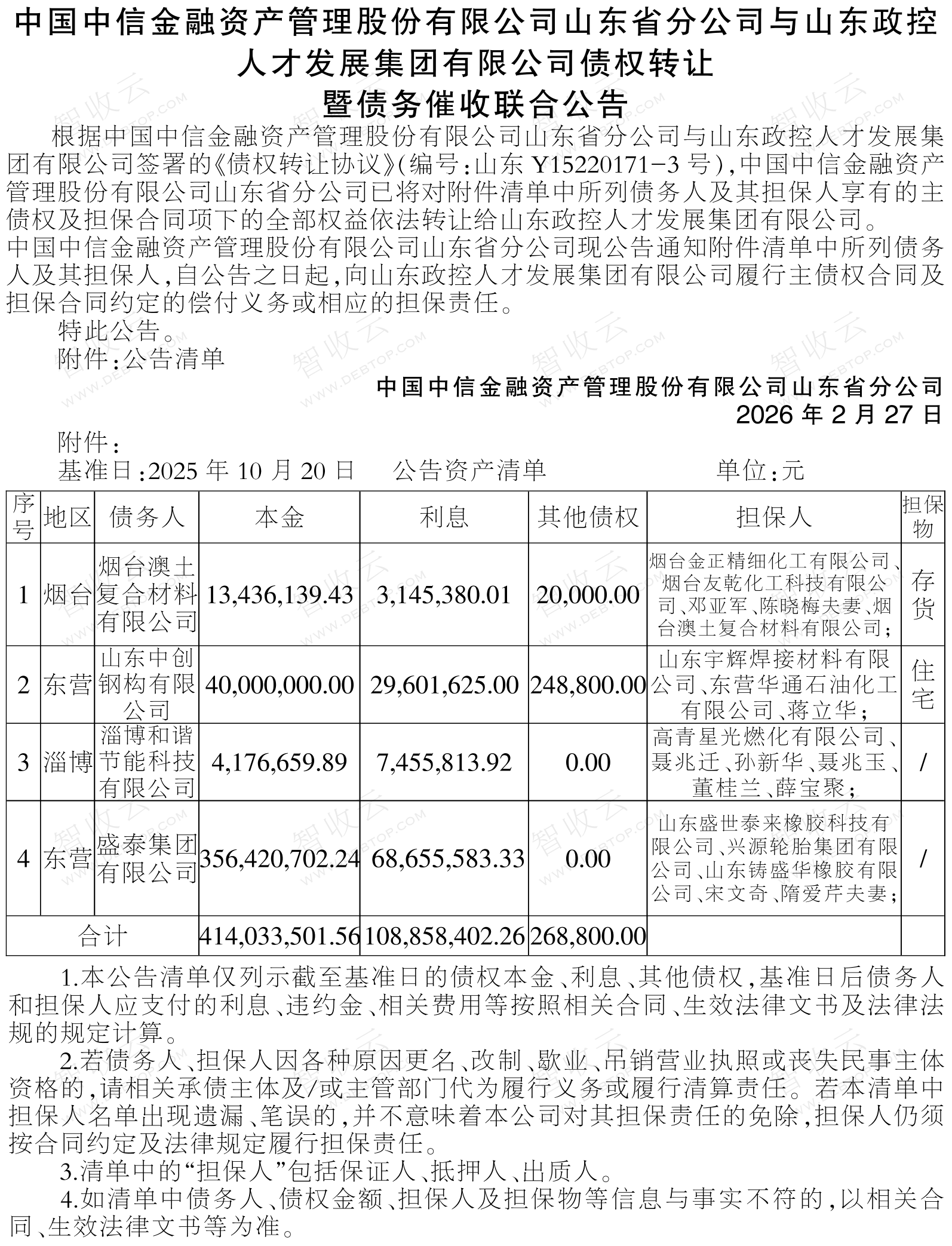 盛泰集团有限公司,淄博和谐节能科技有限公司中国中信金融资产管理股份有限公司山东省分公司与山东政控人才发展集团有限公司债权转让暨债务催收联合公告 AMC转出