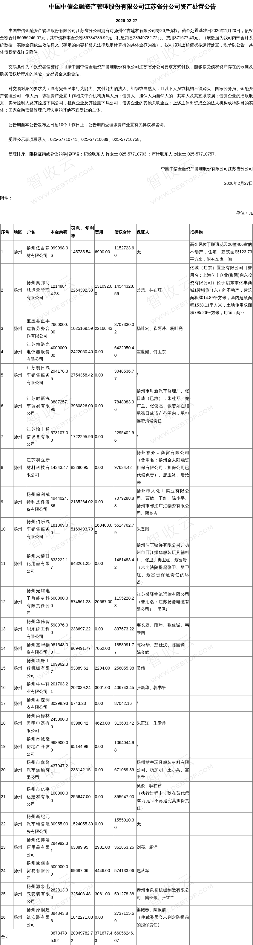 扬州奥邦商城运营管理有限公司,江苏精湛光电仪器股份有限公司,中国中信金融资产管理股份有限公司江苏省分公司资产处置公告,公告日期:2026-02-27,债权方:中国中信金融资产管理股份有限公司江苏省分公司,资产总额:6605.6万元。