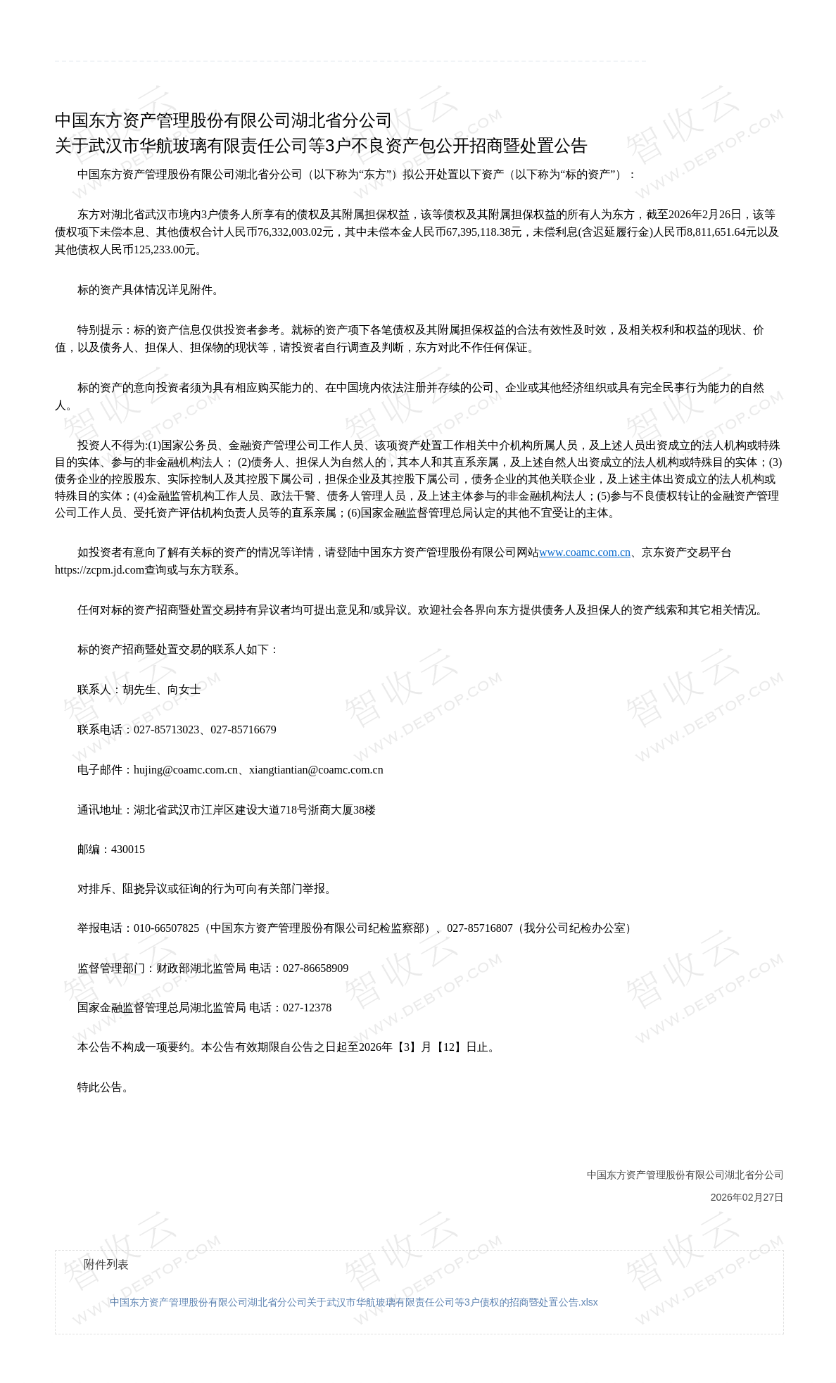 武汉百斯特镜业有限公司,武汉市华航玻璃有限责任公司,中国东方资产管理股份有限公司湖北省分公司关于武汉市华航玻璃有限责任公司等3户不良资产包公开招商暨处置公告,公告日期:2026-02-27,债权方:中国东方资产管理股份有限公司湖北省分公司,资产总额:7633.2万元。