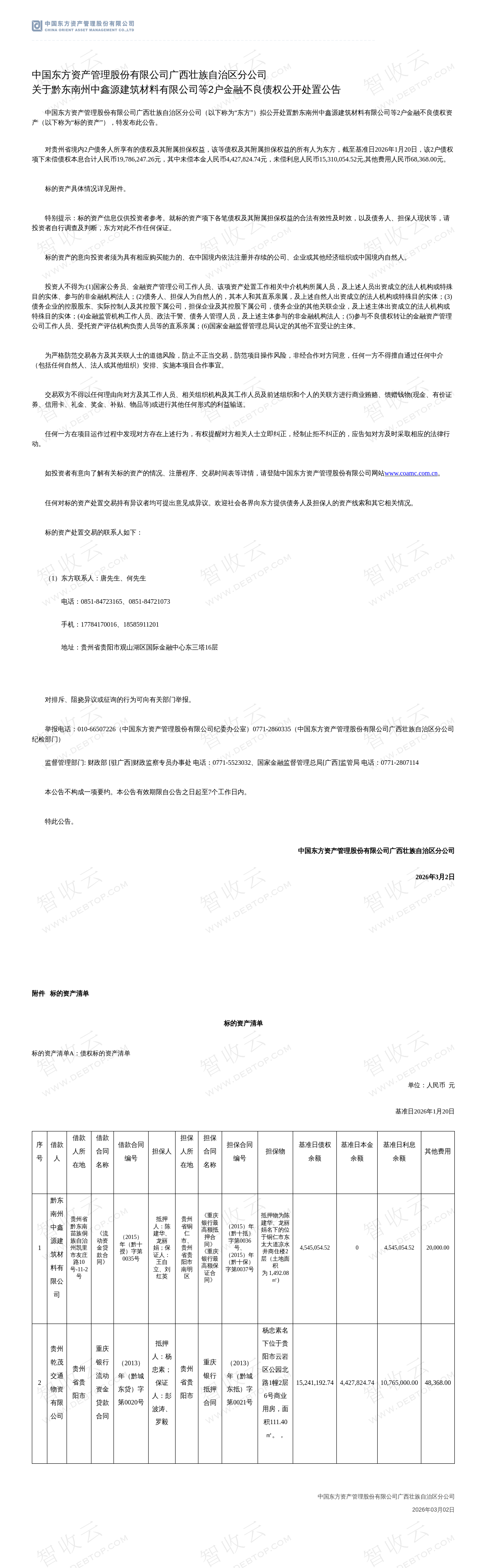 黔东南州中鑫源建筑材料有限公司,贵州乾茂交通物资有限公司,中国东方资产管理股份有限公司广西壮族自治区分公司关于黔东南州中鑫源建筑材料有限公司等2户金融不良债权公开处置公告,公告日期:2026-03-02,债权方:中国东方资产管理股份有限公司广西壮族自治区分公司,资产总额:1980.6万元。