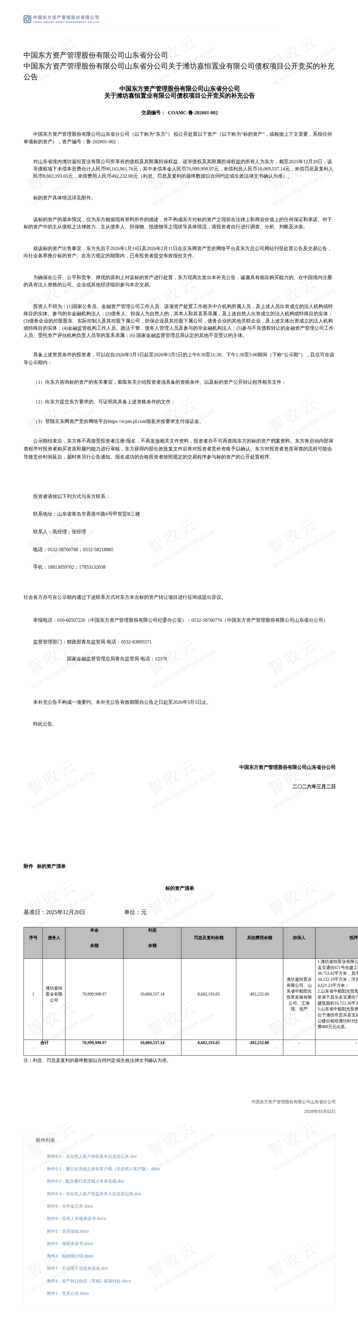 中国东方资产管理股份有限公司山东省分公司关于潍坊嘉恒置业有限公司债权项目公开竞买的补充公告 补充公告