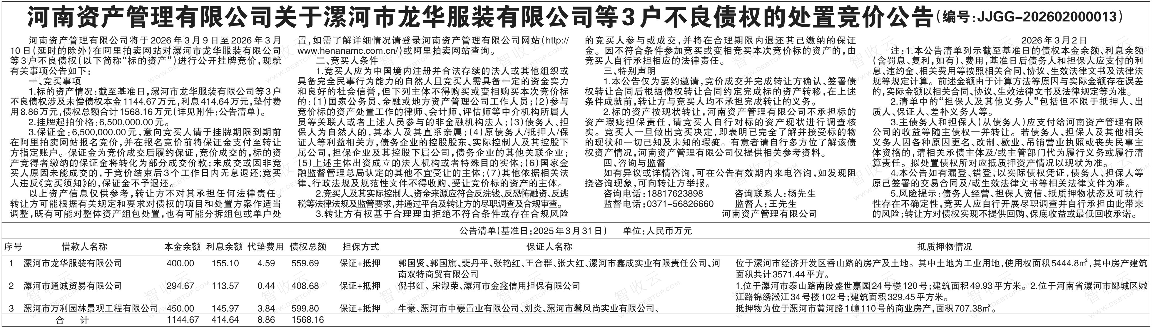 漯河市通诚贸易有限公司,漯河市龙华服装有限公司,河南资产管理有限公司关于漯河市龙华服装有限公司等3户不良债权的处置竞价公告,公告日期:2026-03-02,债权方:河南资产管理有限公司,资产总额:1568.2万元。
