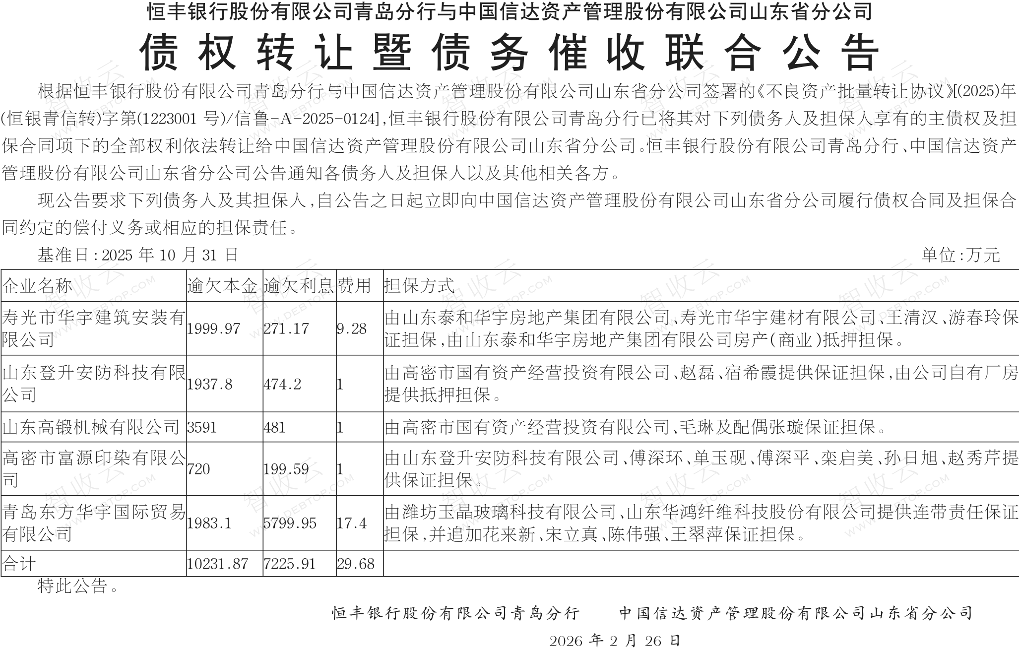 高密市富源印染有限公司,山东登升安防科技有限公司,恒丰银行股份有限公司青岛分行与中国信达资产管理股份有限公司山东省分公司债权转让暨债务催收联合公告,公告日期:2026-03-02,转让方:恒丰银行股份有限公司青岛分行,受让方:中国信达资产管理股份有限公司山东省分公司,资产总额:17487.5万元。