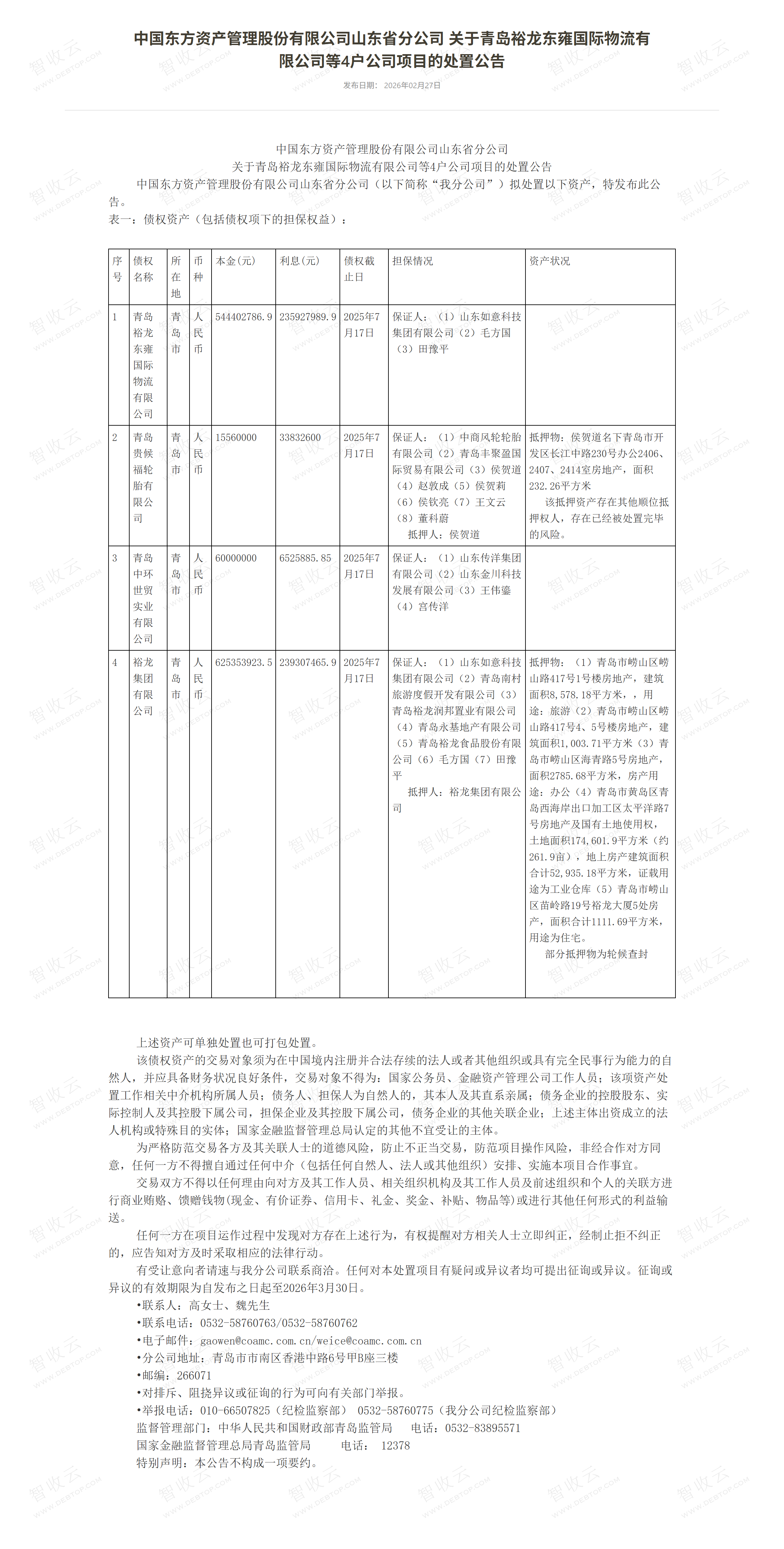 青岛裕龙东雍国际物流有限公司,青岛贵候福轮胎有限公司中国东方资产管理股份有限公司山东省分公司关于青岛裕龙东雍国际物流有限公司等4户公司项目的处置公告