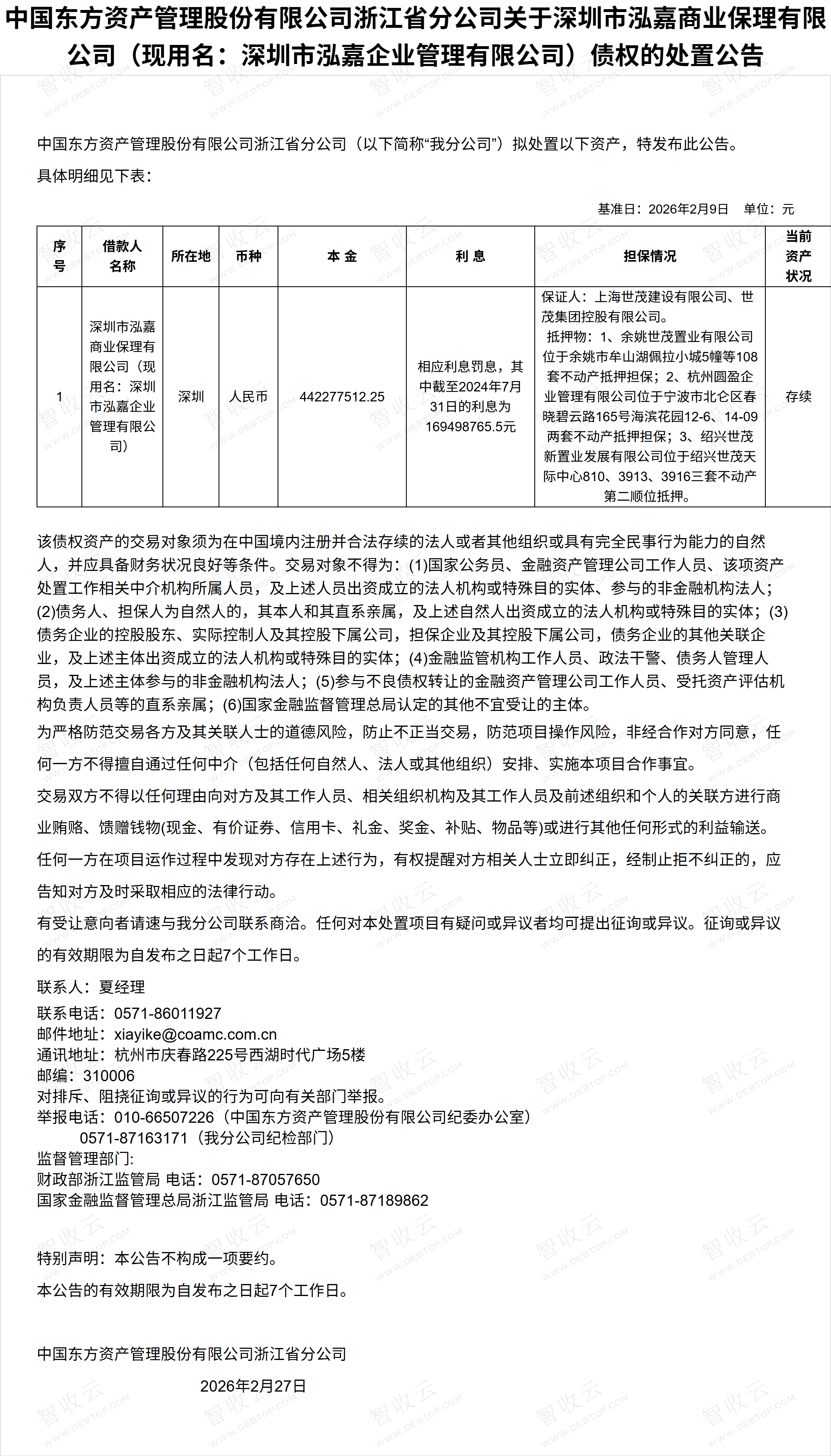 深圳市泓嘉商业保理有限公司,上海世茂建设有限公司,中国东方资产管理股份有限公司浙江省分公司关于深圳市泓嘉商业保理有限公司(现用名:深圳市泓嘉企业管理有限公司)债权的处置公告,公告日期:2026-02-27,债权方:中国东方资产管理股份有限公司浙江省分公司,资产总额:61177.6万元。