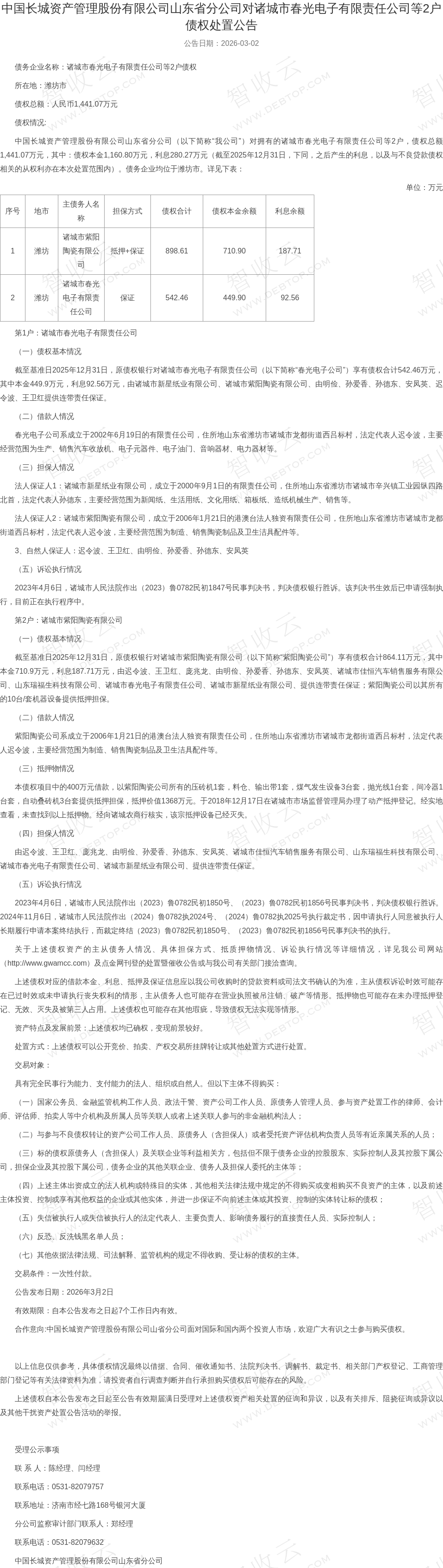 诸城市紫阳陶瓷有限公司,诸城市春光电子有限责任公司,中国长城资产管理股份有限公司山东省分公司对诸城市春光电子有限责任公司等2户债权处置公告,公告日期:2026-03-02,债权方:中国长城资产管理股份有限公司山东省分公司,资产总额:1441.1万元。