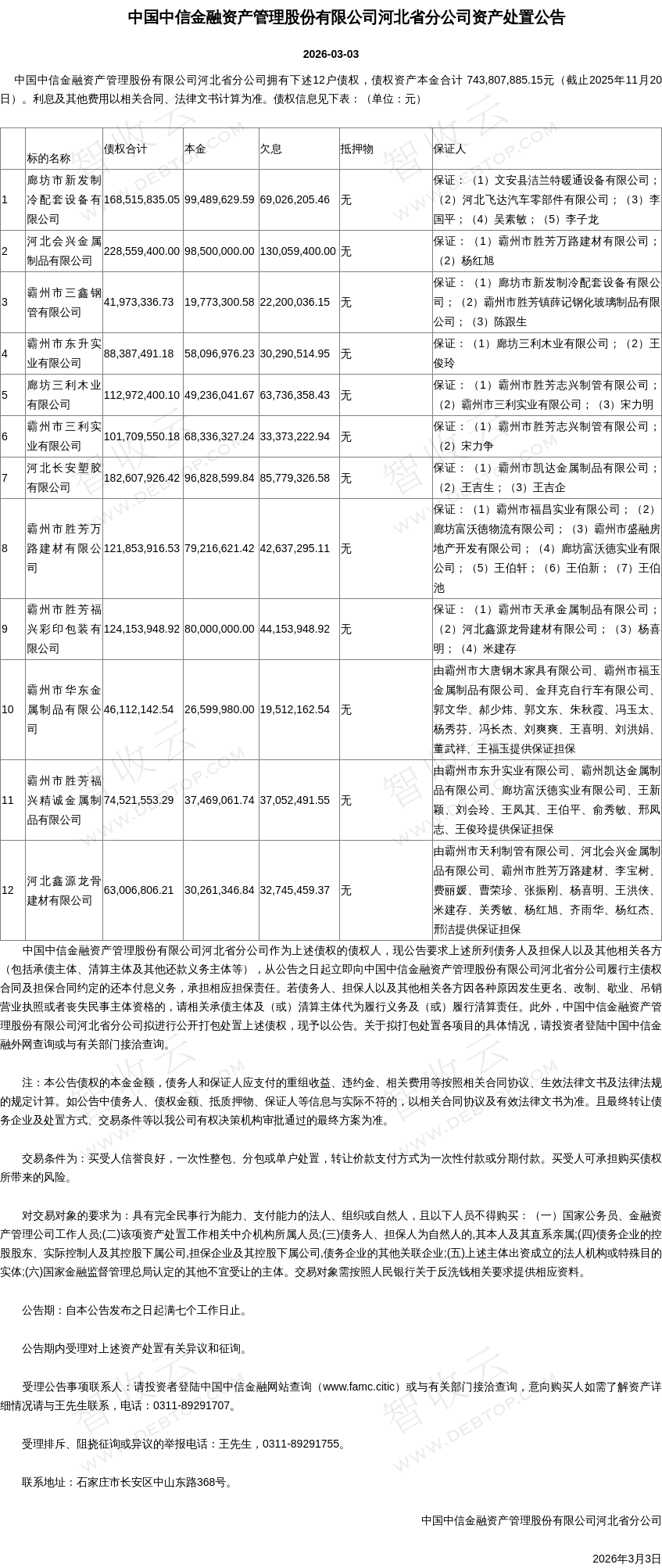 霸州市胜芳万路建材有限公司,河北会兴金属制品有限公司,中国中信金融资产管理股份有限公司河北省分公司资产处置公告,公告日期:2026-03-03,债权方:中国中信金融资产管理股份有限公司河北省分公司,资产总额:135437.4万元。