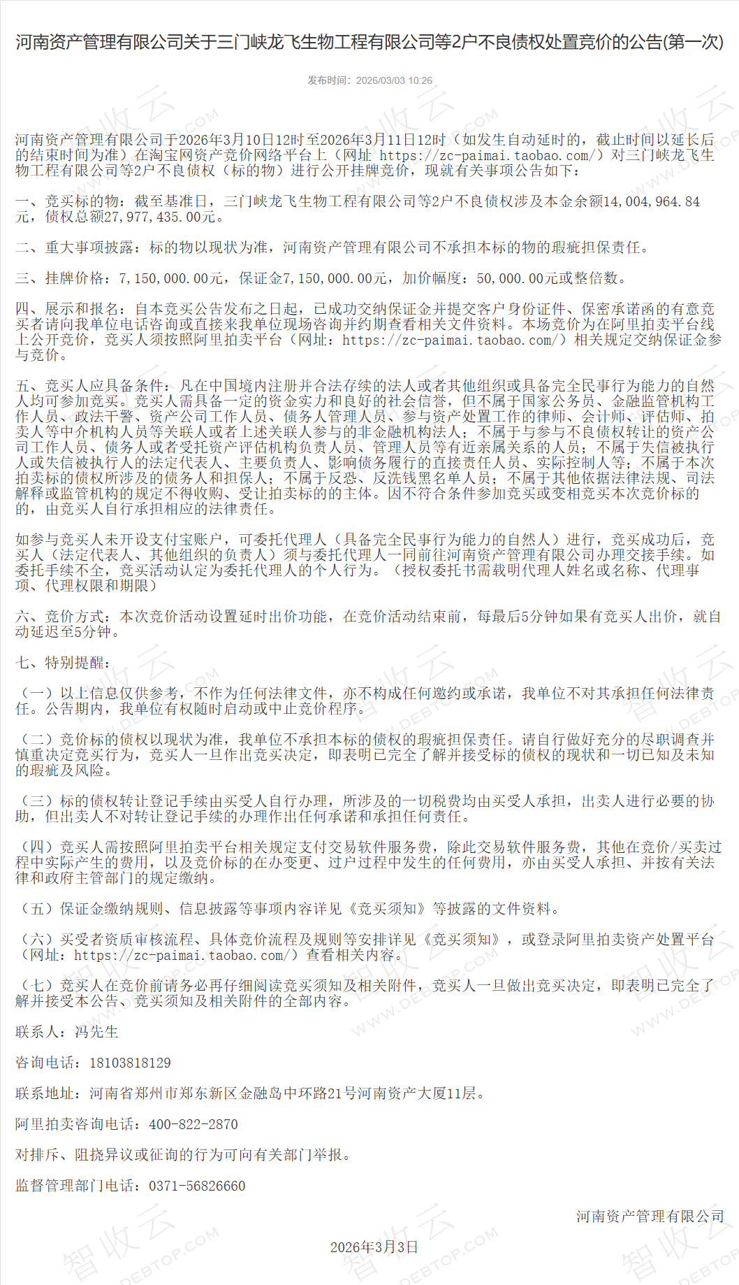 三门峡龙飞生物工程有限公司,河南资产管理有限公司关于三门峡龙飞生物工程有限公司等2户不良债权处置竞价的公告(第一次),公告日期:2026-03-03,债权方:河南资产管理有限公司,资产总额:2797.7万元。