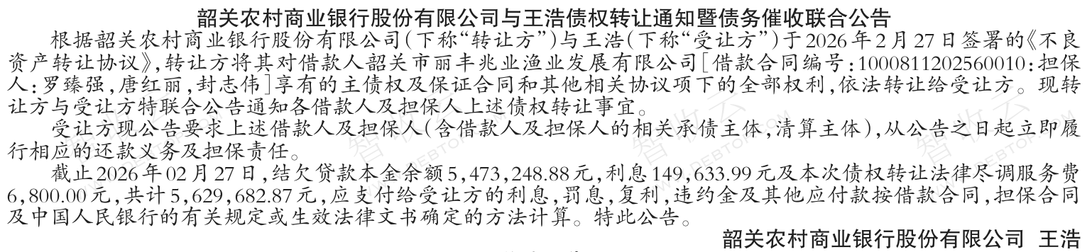 韶关市丽丰兆业渔业发展有限公司,韶关农村商业银行股份有限公司与王浩债权转让通知暨债务催收联合公告,公告日期:2026-03-04,转让方:韶关农村商业银行股份有限公司,受让方:王浩,资产总额:563.0万元。