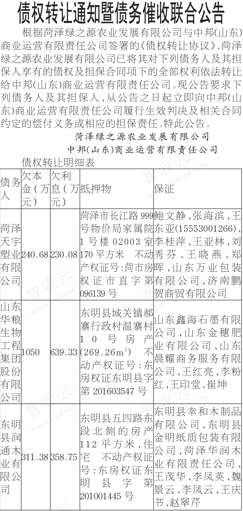 菏泽天宇塑业有限公司,东明县润通木业有限公司,债权转让通知暨债务催收联合公告,公告日期:2026-03-04,转让方:菏泽绿之源农业发展有限公司,受让方:中邦(山东)商业运营有限责任公司,资产总额:2830.2万元。