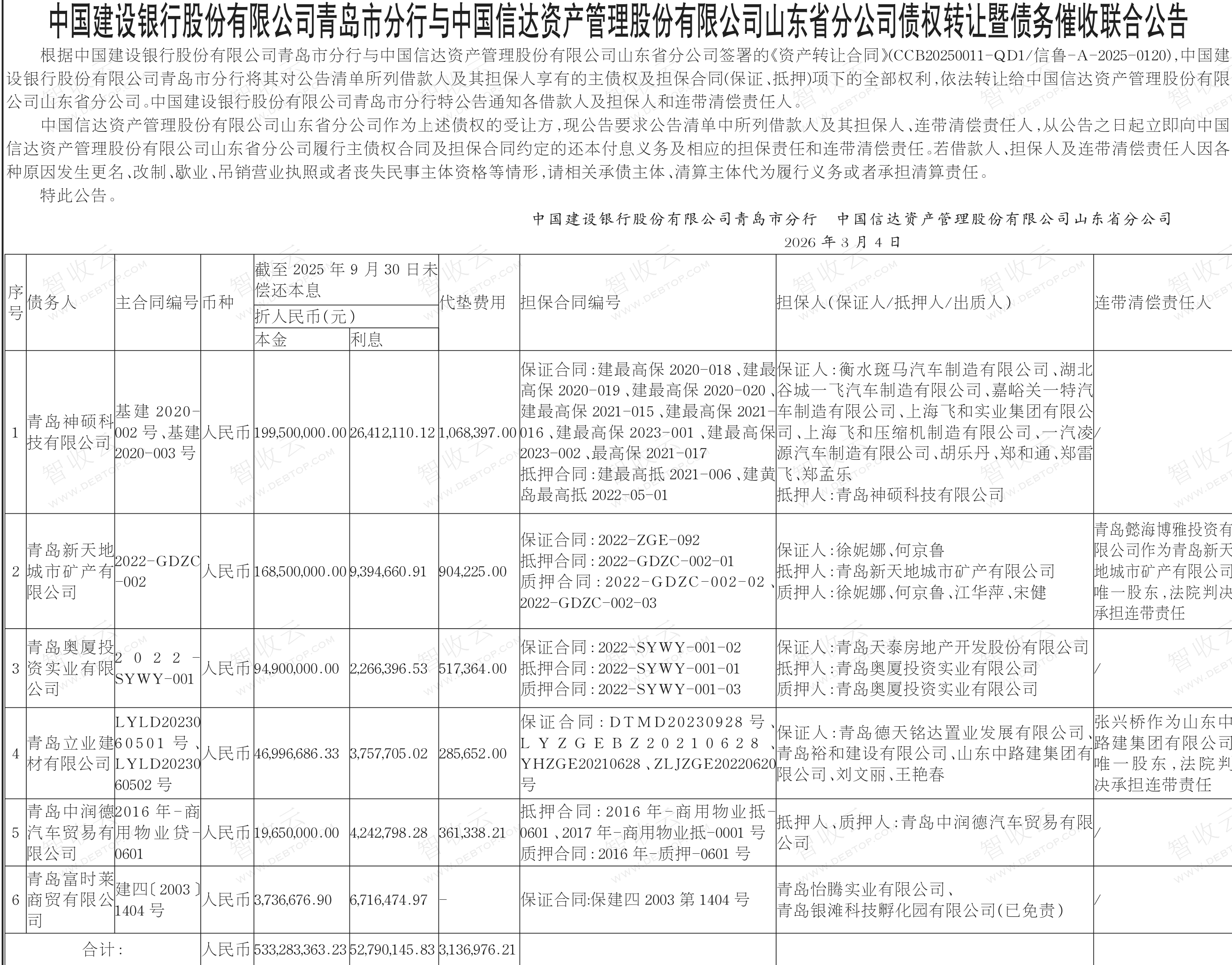青岛中润德汽车贸易有限公司,青岛立业建材有限公司,中国建设银行股份有限公司青岛市分行与中国信达资产管理股份有限公司山东省分公司债权转让暨债务催收联合公告,公告日期:2026-03-04,转让方:中国建设银行股份有限公司青岛市分行,受让方:中国信达资产管理股份有限公司山东省分公司,资产总额:58921.0万元。