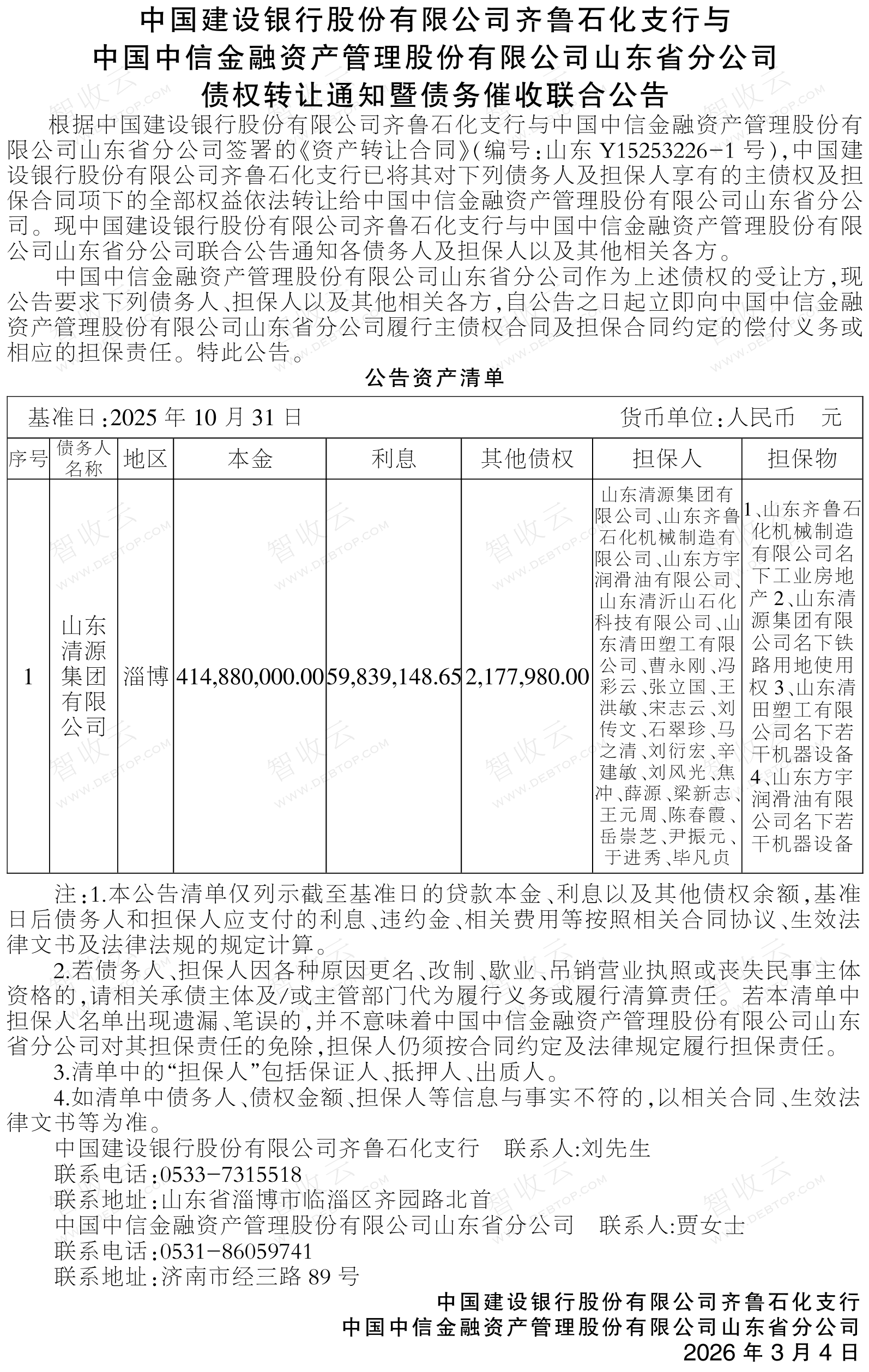 山东清源集团有限公司,山东齐鲁石化机械制造有限公司,中国建设银行股份有限公司齐鲁石化支行与中国中信金融资产管理股份有限公司山东省分公司债权转让通知暨债务催收联合公告,公告日期:2026-03-04,转让方:中国建设银行股份有限公司齐鲁石化支行,受让方:中国中信金融资产管理股份有限公司山东省分公司,资产总额:47689.7万元。