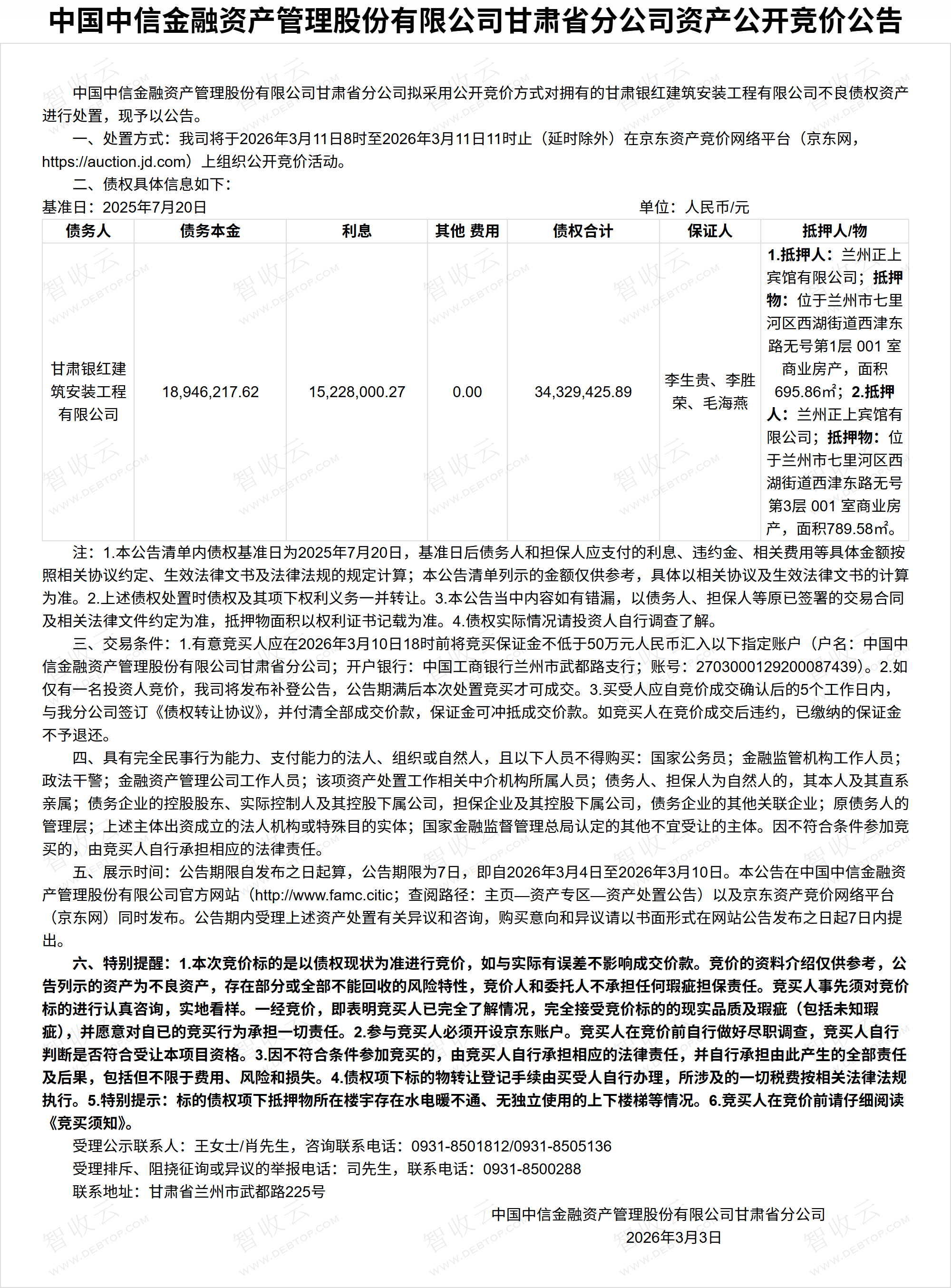 甘肃银红建筑安装工程有限公司,兰州正上宾馆有限公司,中国中信金融资产管理股份有限公司甘肃省分公司资产公开竞价公告,公告日期:2026-03-04,债权方:中国中信金融资产管理股份有限公司甘肃省分公司,资产总额:3432.9万元。