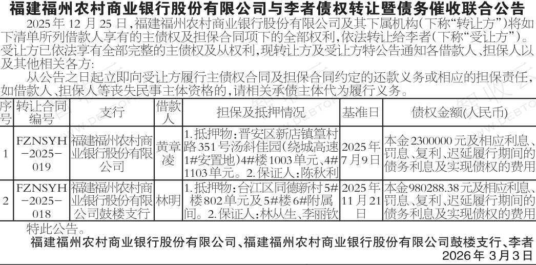 转让公告福建福州农村商业银行股份有限公司与李者债权转让暨债务催收联合公告 银行转出,福建福州农村商业银行股份有限公司与李者债权转让暨债务催收联合公告,公告日期:2026-03-05,转让方:福建福州农村商业银行股份有限公司,福建福州农村商业银行股份有限公司鼓楼支行,受让方:李者,资产总额:328.0万元。黄章凌,林明等2户。来源:国际商报 公告日期:2026-03-05债权金额328.02万债权本金328.02万户数2户
