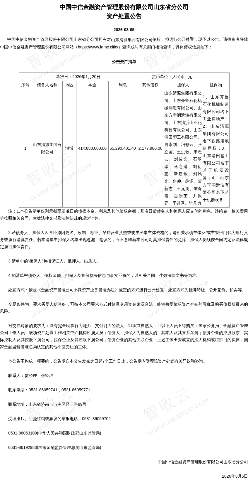 山东清源集团有限公司,山东齐鲁石化机械制造有限公司,中国中信金融资产管理股份有限公司山东省分公司资产处置公告,公告日期:2026-03-05,债权方:中国中信金融资产管理股份有限公司山东省分公司,资产总额:48234.8万元。