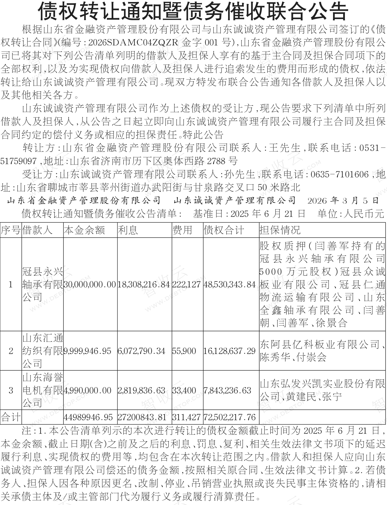冠县永兴轴承有限公司,山东海誉电机有限公司,债权转让通知暨债务催收联合公告,公告日期:2026-03-05,转让方:山东省金融资产管理股份有限公司,受让方:山东诚诚资产管理有限公司,资产总额:7250.2万元。