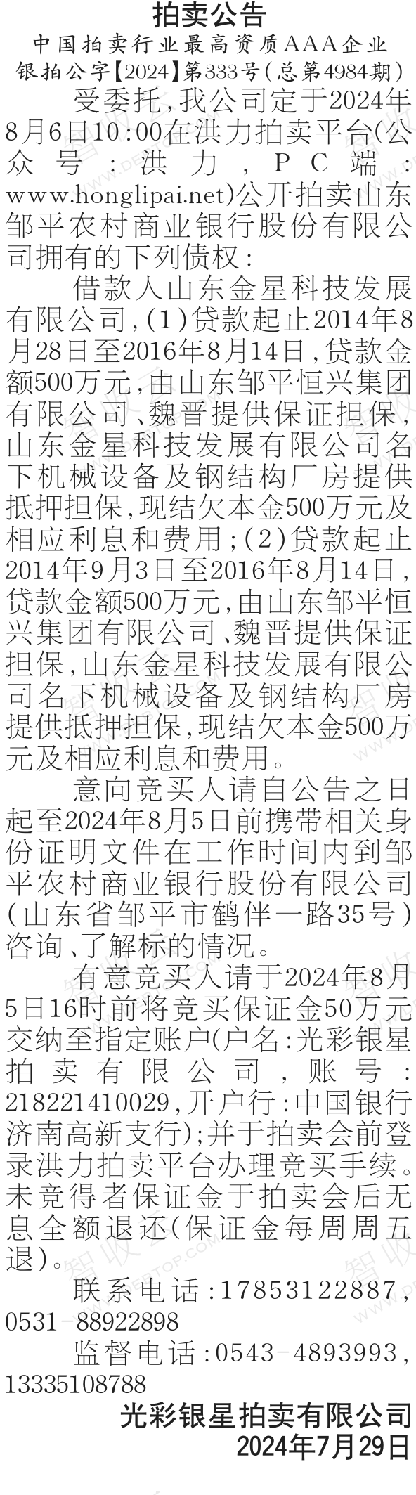 山东金星科技发展有限公司,山东邹平恒兴集团有限公司,拍卖公告,公告日期:2024-07-29,债权方:光彩银星拍卖有限公司,资产总额:1000.0万元。