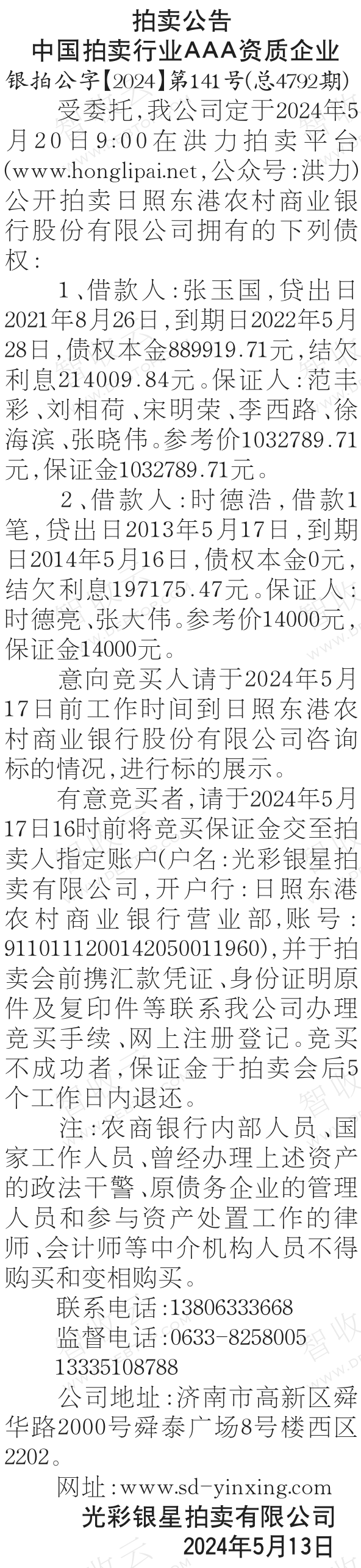 处置公告拍卖公告 ,拍卖公告,公告日期:2024-05-13,债权方:光彩银星拍卖有限公司,资产总额:104.7万元。时德浩,张玉国等2户。来源:经济导报 公告日期:2024-05-13债权金额104.67万债权本金88.99万户数2户联系方式光彩银星拍卖有限公司-13806333668,0633-8258005,13335108788