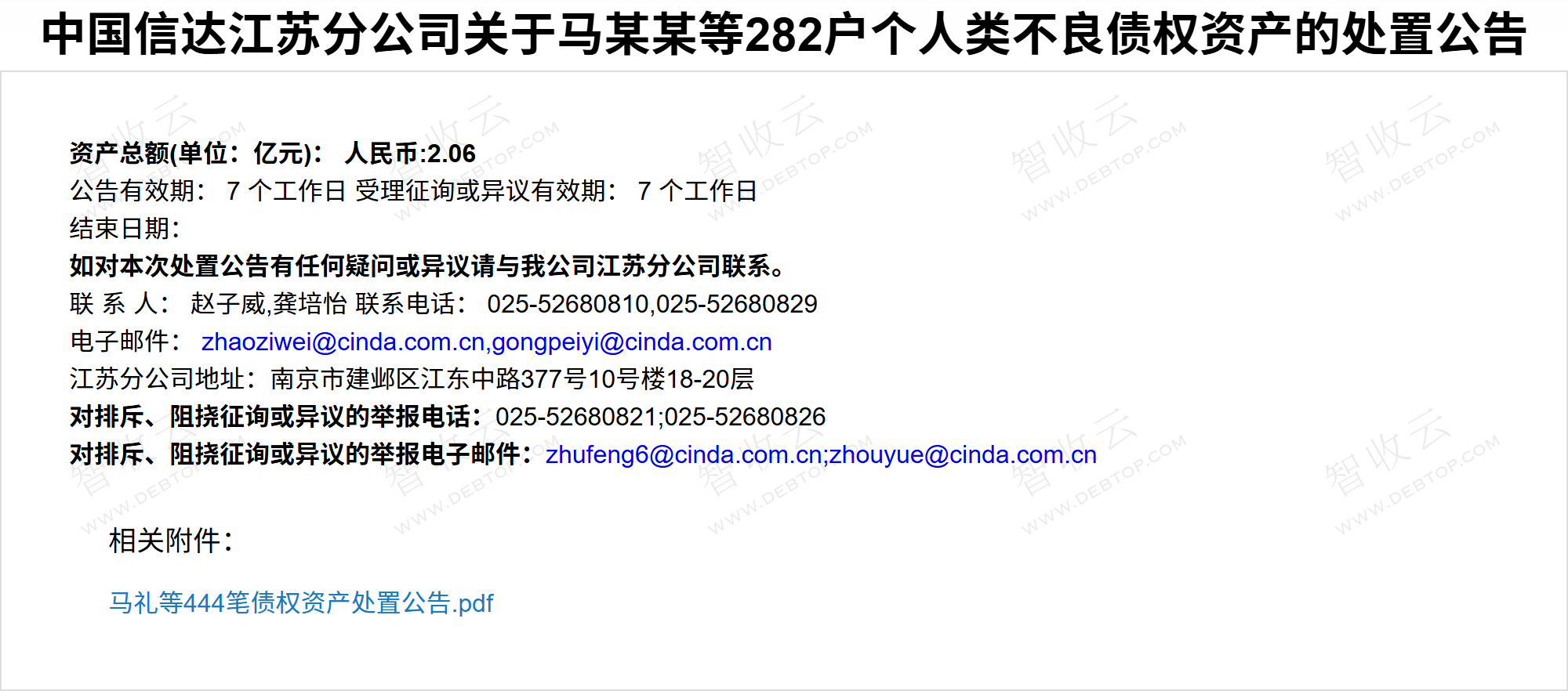 中国信达江苏分公司关于马某某等282户个人类不良债权资产的处置公告