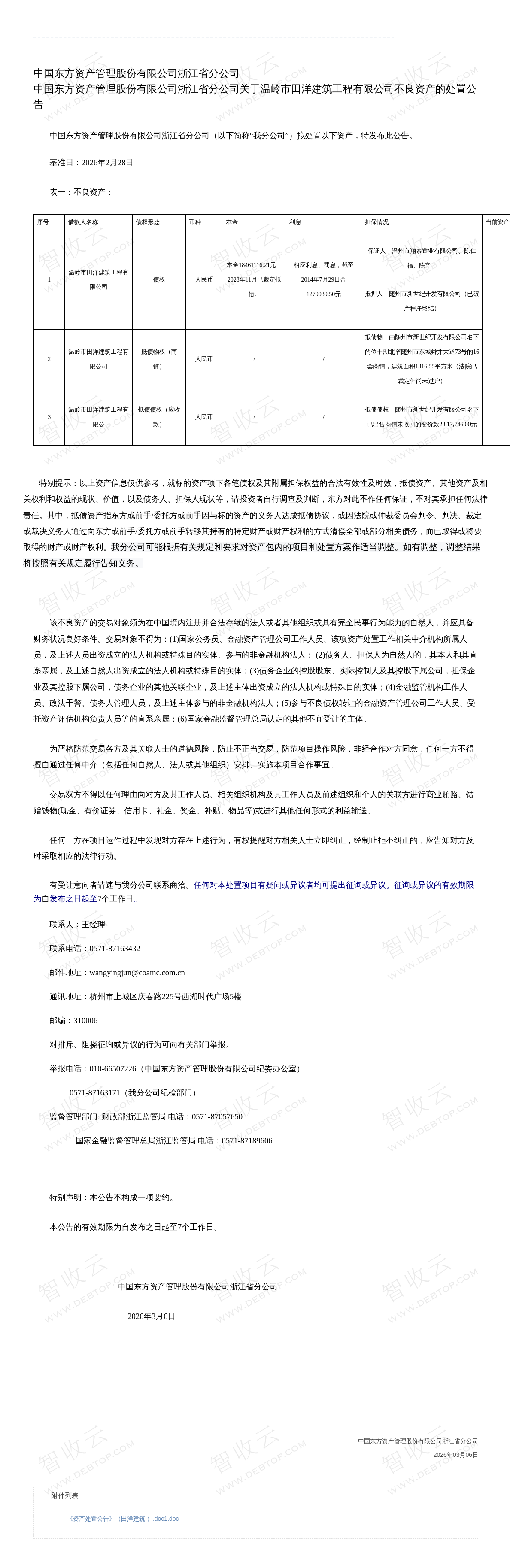 温岭市田洋建筑工程有限公司中国东方资产管理股份有限公司浙江省分公司关于温岭市田洋建筑工程有限公司不良资产的处置公告