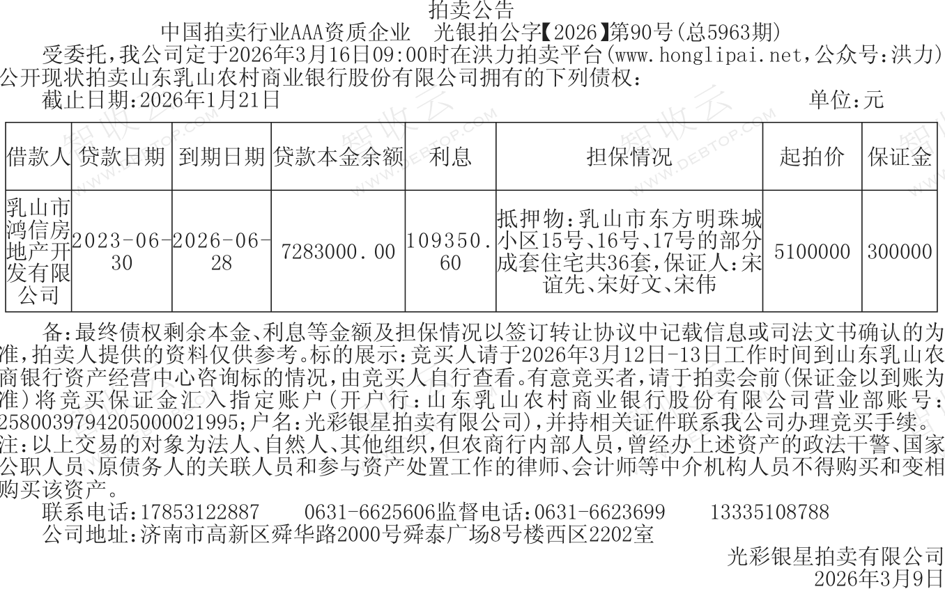 处置公告拍卖公告 乳山市鸿信房地产开发有限公司,拍卖公告,公告日期:2026-03-09,债权方:光彩银星拍卖有限公司,资产总额:739.2万元。乳山市鸿信房地产开发有限公司等1户。来源:齐鲁晚报 公告日期:2026-03-09债权金额739.23万债权本金728.3万户数1户所涉债务企业乳山市鸿信房地产开发有限公司联系方式光彩银星拍卖有限公司-17853122887, 0631-6625606, 0631-6623699, 13335108788