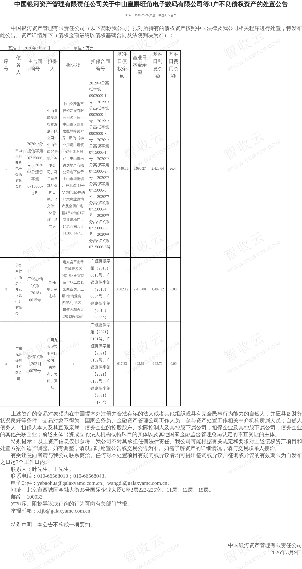 创富商贸广场房产开发(惠州)有限公司,广东九天绿药业有限公司,中国银河资产管理有限责任公司关于中山皇爵旺角电子数码有限公司等3户不良债权资产的处置公告,公告日期:2026-03-09,债权方:中国银河资产管理有限责任公司,资产总额:10959.7万元。