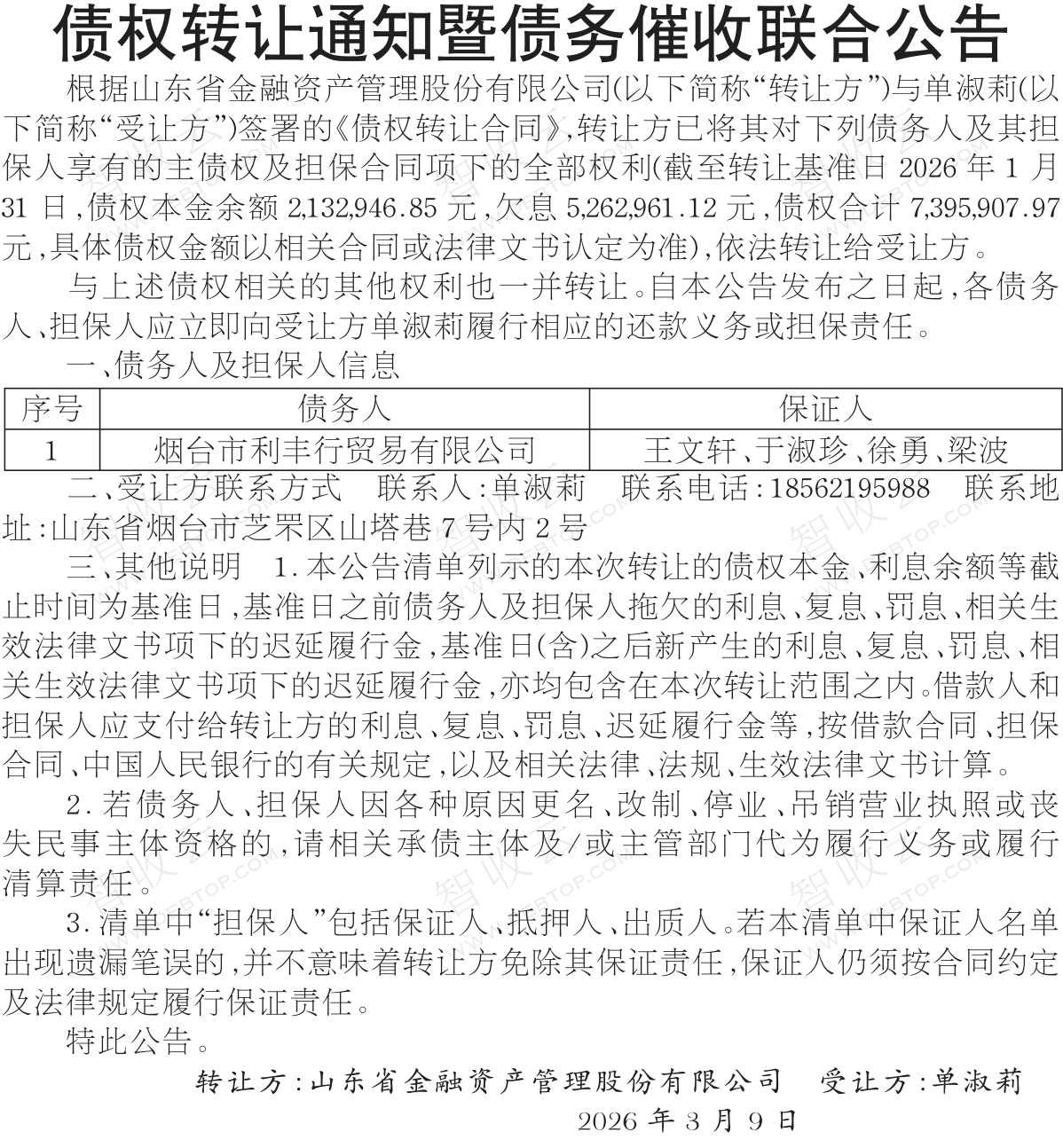 烟台市利丰行贸易有限公司,债权转让通知暨债务催收联合公告,公告日期:2026-03-09,转让方:山东省金融资产管理股份有限公司,受让方:单淑莉,资产总额:739.6万元。