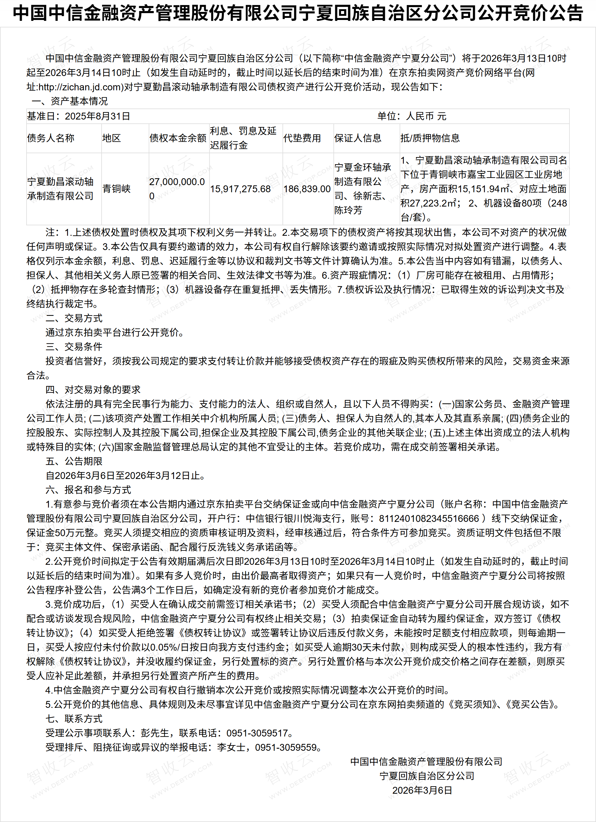 宁夏勤昌滚动轴承制造有限公司,宁夏金环轴承制造有限公司,中国中信金融资产管理股份有限公司宁夏回族自治区分公司公开竞价公告,公告日期:2026-03-09,债权方:中国中信金融资产管理股份有限公司宁夏回族自治区分公司,资产总额:4310.4万元。